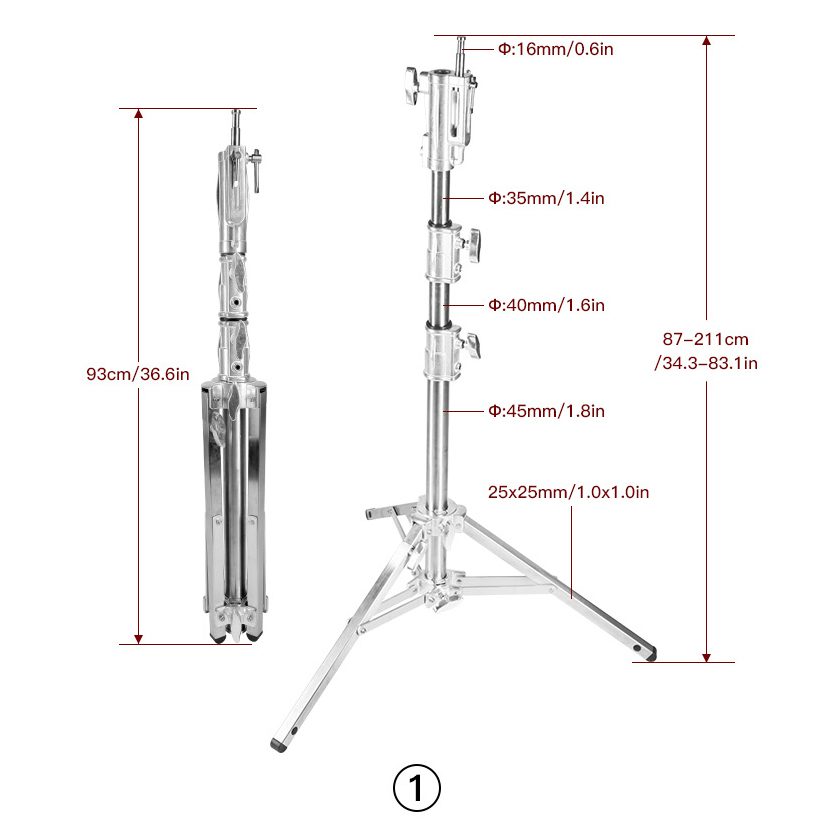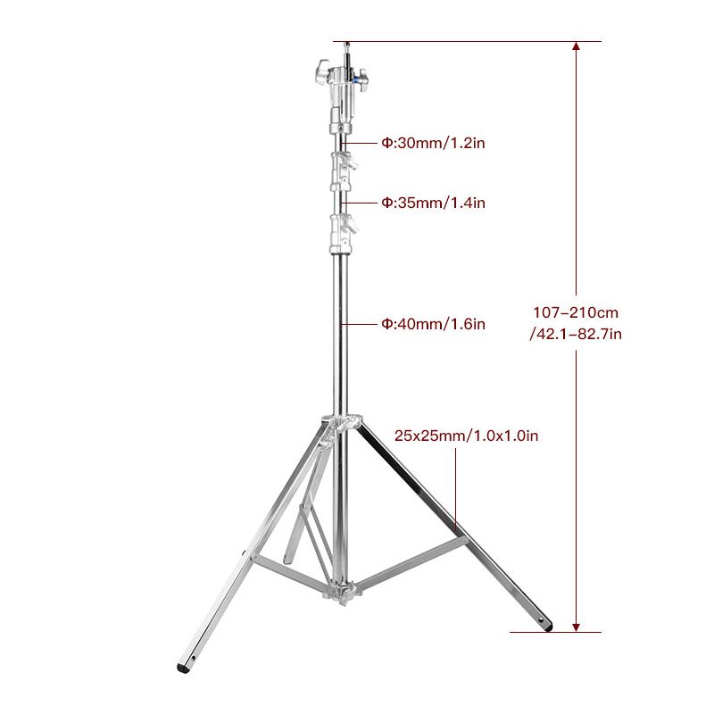 Το E-Image HS02 Plus είναι ένα βαρέως τύπου Cine Light Stand ικανό να ανυψώσει σε μέγιστο ύψος 2,10 m βάρος μέχρι και 15 kgs με αξιοπιστία και σταθερότητα. Διαθέτει τριπλό universal τελείωμα με 1-1/8’’ – 28mm junior receiver, 5/8’’ – 16mm baby receiver και multi direction 5/8’’ – 16mm baby stud για μέγιστη ευελιξία επιλογών mounting. Διαθέτει ένα πτυσσόμενο πόδι για εύκολη χρήση σε ανώμαλο έδαφος.