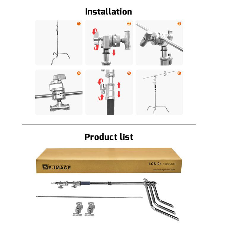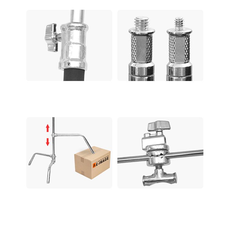 Το E-Image LCS-04 είναι ένα επαγγελματικό C-Stand με Grip Arm, κατασκευασμένο από ανοξείδωτο ατσάλι. Είναι ικανό να ανυψώσει το studio flash σας ή οποιοδήποτε φωτιστικό με μέγιστο βάρος 20kgs με ασφάλεια. Το ένα από τα τρία πόδια της βάσης του είναι ρυθμιζόμενο σε ύψος.