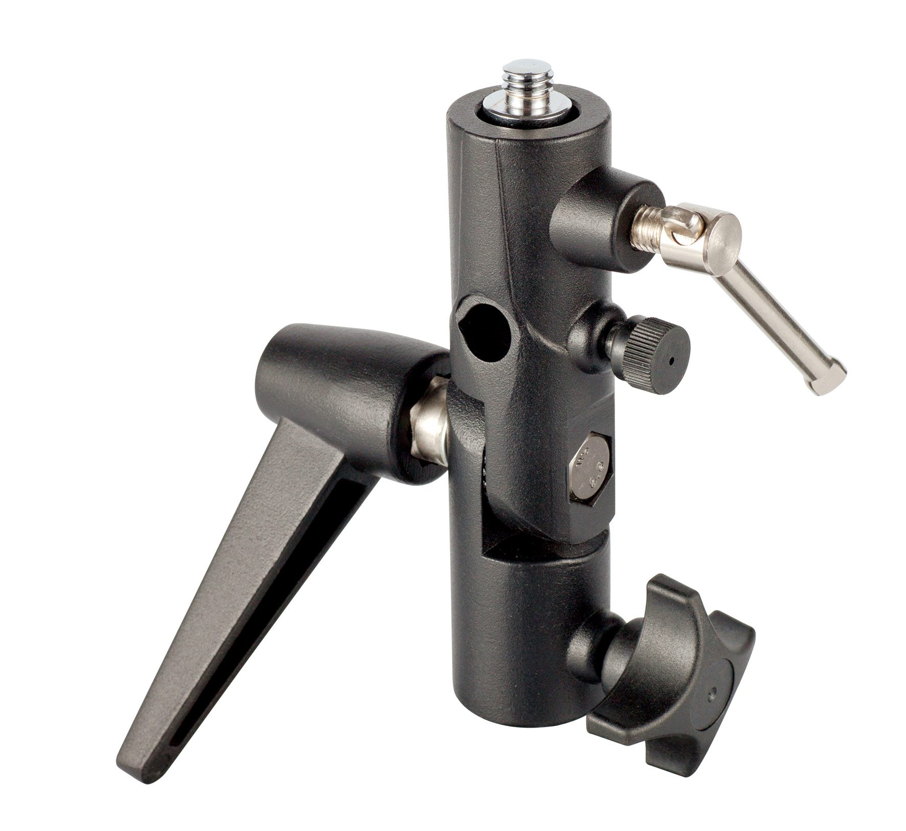 Μεταλλικός Heavy Duty μηχανισμός στήριξης Flash ή LED σε light stands. Επιτρέπει τη στήριξη σε μεταβαλλόμενη κλίση, καθώς και τη στήριξη ομπρέλας. Στο κάτω μέρος του διαθέτει χωνευτή υποδοχή (socket) 5/8″ και στο άνω μέρος του 1/4″ Male – 3/8″ Male Adapter.