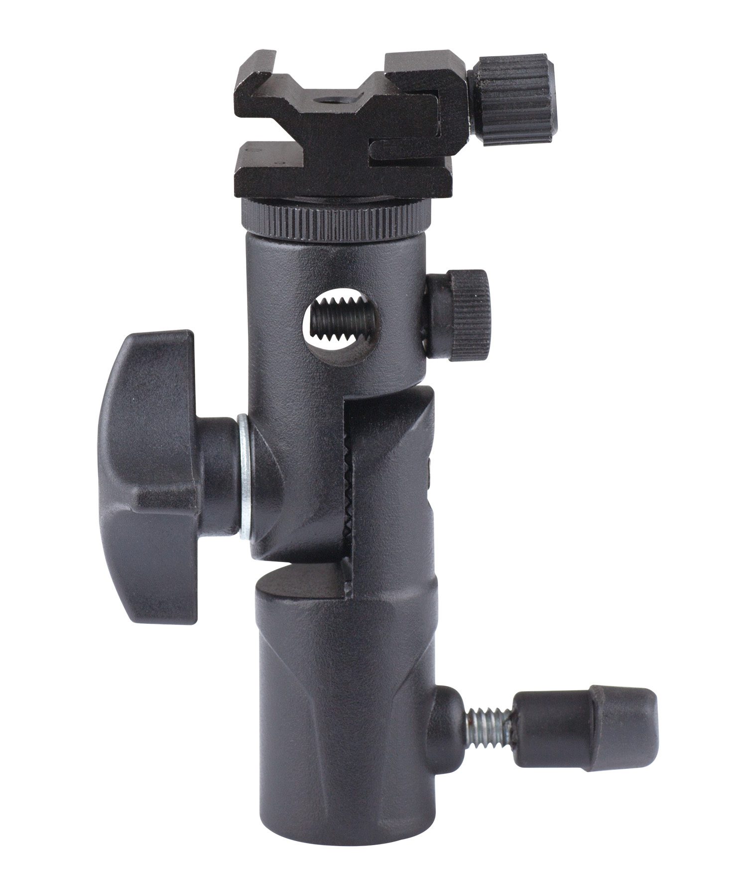 Μεταλλικός Heavy Duty μηχανισμός στήριξης Flash ή LED σε light stands. Επιτρέπει τη στήριξη σε μεταβαλλόμενη κλίση, καθώς και τη στήριξη ομπρέλας. Στο κάτω μέρος του διαθέτει χωνευτή υποδοχή (socket) 5/8″ και στο άνω μέρος του 1/4″ Male – 3/8″ Male Adapter. Συνοδεύεται από αφαιρούμενη υποδοχή hotshoe.