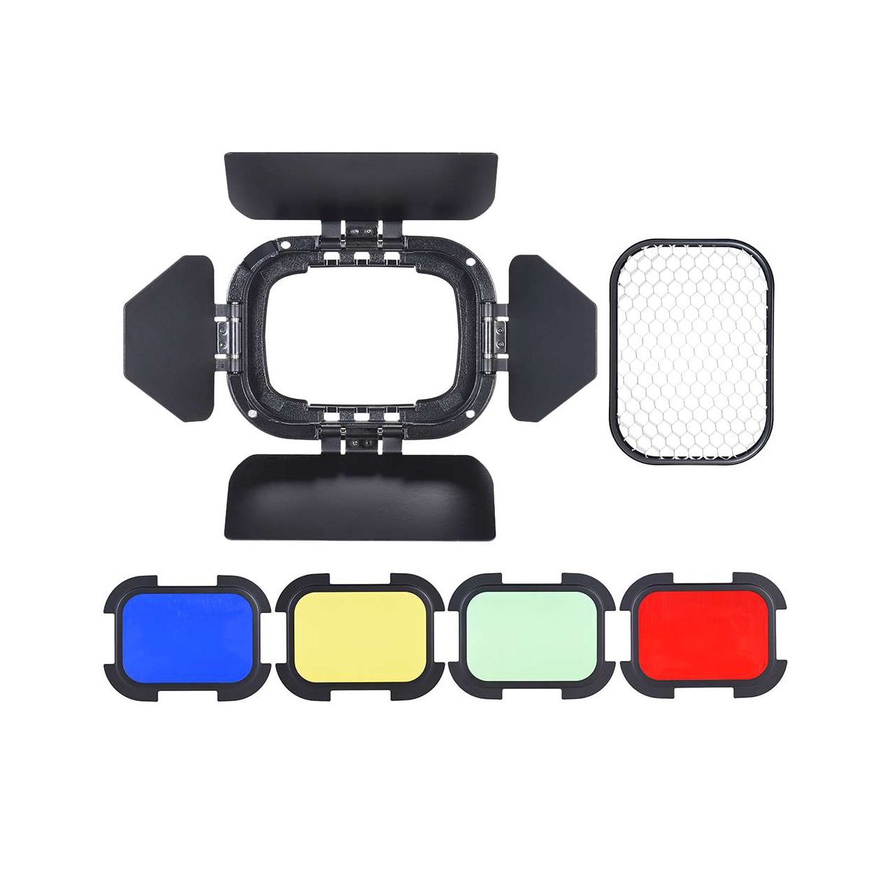 Η συσκευασία περιλαμβάνει: 1 Barn door 4 Color filters 1 Honeycomb grid 1 SONOVEL Clean Cloth