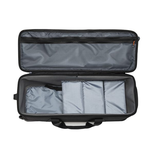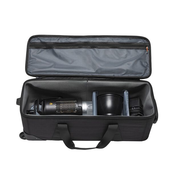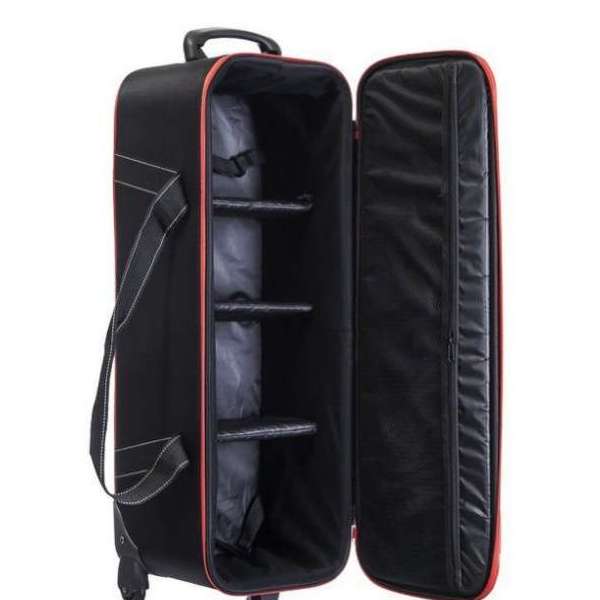 Τσάντα μεταφοράς που διαθέτει ανθεκτική επένδυση, κινητά διαχωριστικά, ροδάκια και χερούλι.