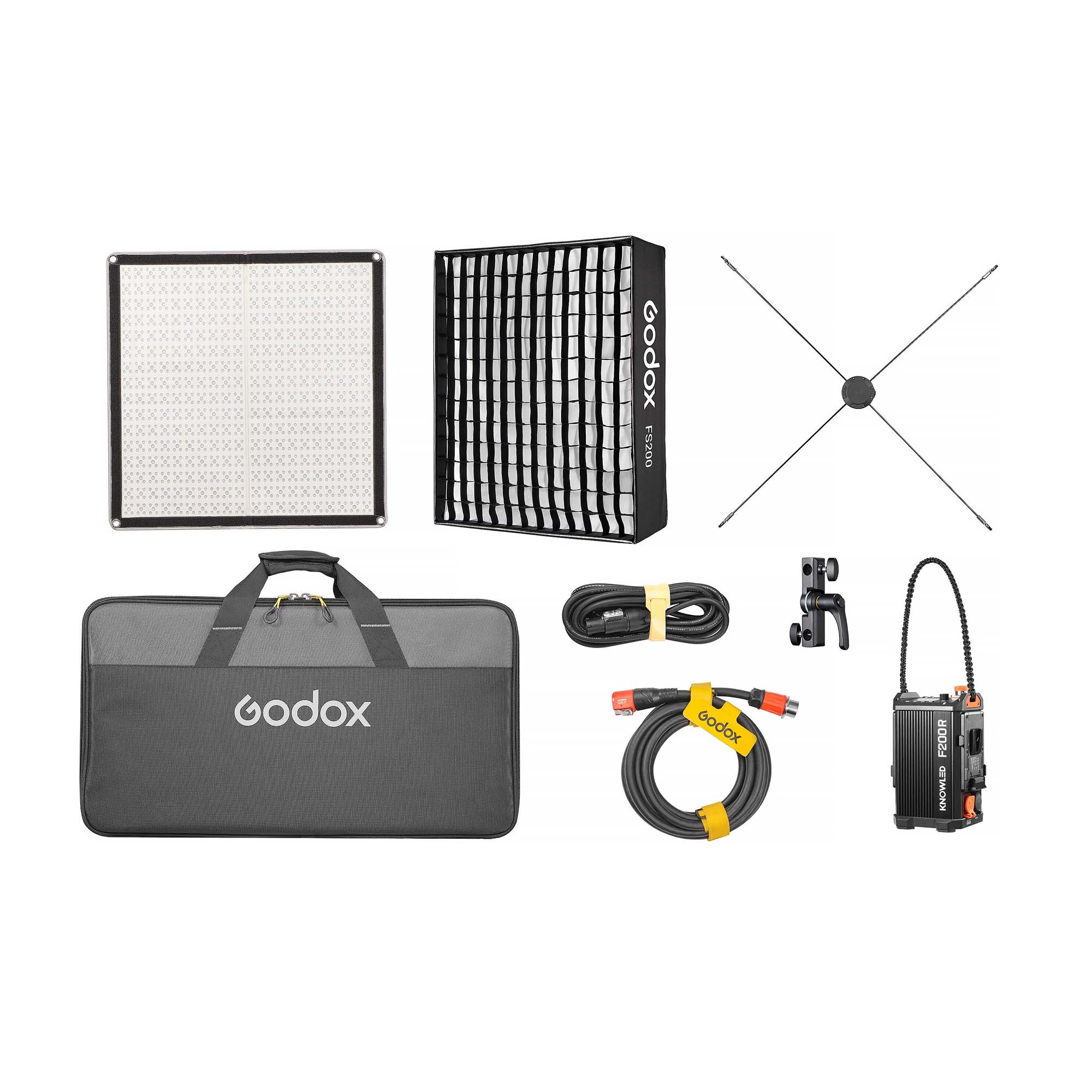 Η συσκευασία περιλαμβάνει: Godox KNOWLED F200R RGB Flexible LED Light Mat (60 x 60), controller, μεταλλικό Bracket, Softbox, βάση αντάπτορα (Adapter Holder), καλώδιο σύνδεσης, καλώδιο τροφοδοσίας AC, τσάντα μεταφοράς.