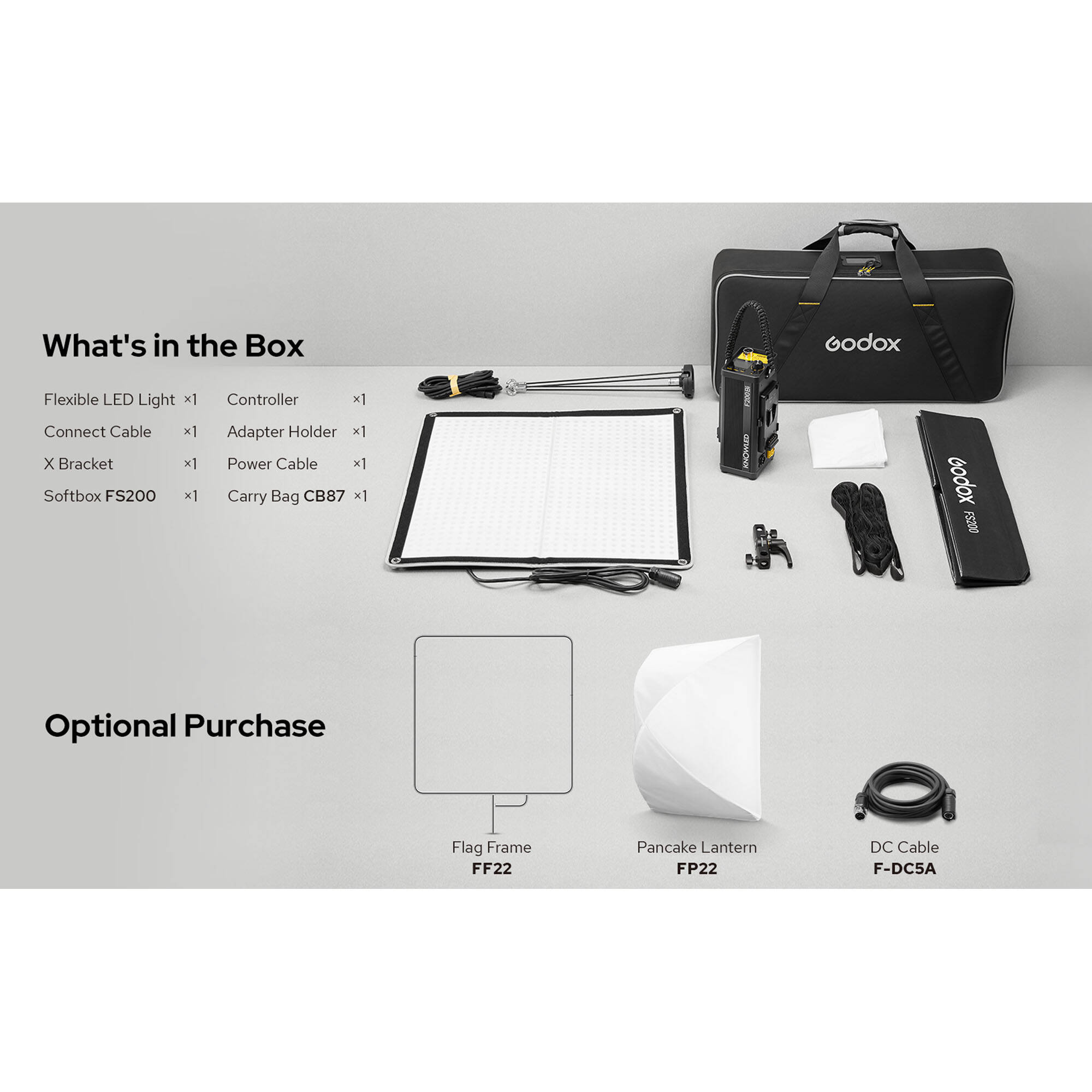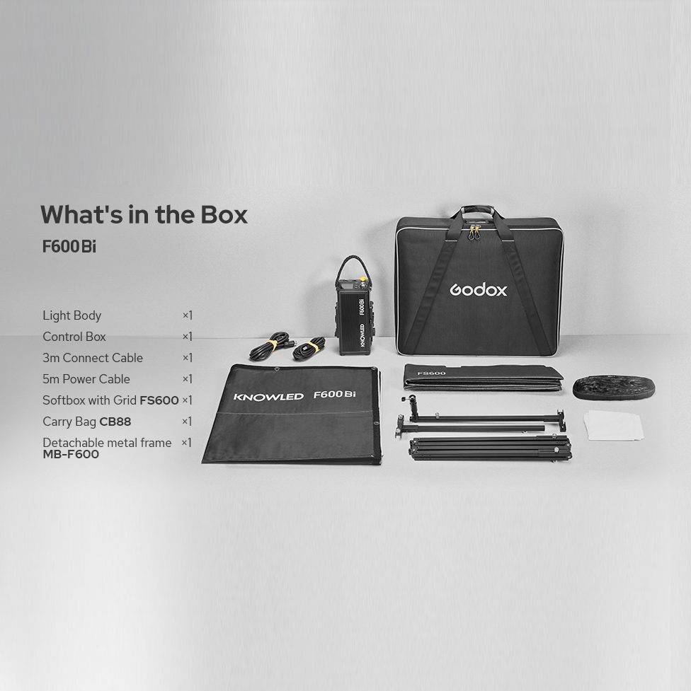 Η συσκευασία περιλαμβάνει: φωτιστικό, controller, x-bracket, καλώδιο σύνδεσης, καλώδιο ρεύματος, softbox με grid, θήκη μεταφοράς, adapter holder, τσάντα μεταφοράς CB87