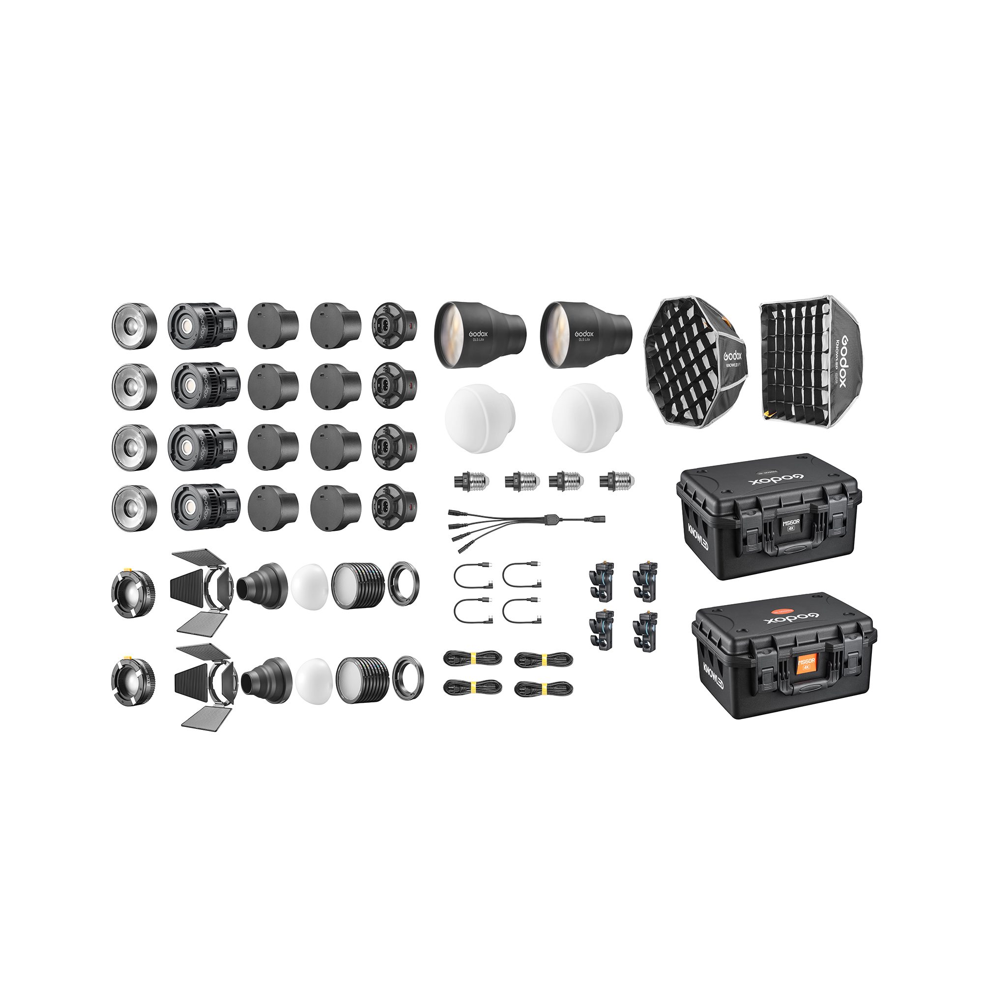 Η συσκευασία περιλαμβάνει: 1x σετ Godox KNOWLED MS60R RGB LED Light (4-Light Kit), 4x σώματα φωτιστικών, 4x ανακλαστήρες φακού, 2x φακοί zoom για MS60Bi & MS60R, 2x ενισχυτές παράλληλης δέσμης DL5 Lite για MS60Bi & MS60R, 2x αναδιπλούμενοι θόλοι διάχυσης, 2x μαγνητικά κιτ για MS60Bi & MS60R, 1x παραβολικό softbox για MS60Bi & MS60R (30 cm), 1x ορθογώνιο softbox για MS60Bi & MS60R (30 x 30 cm), 4x τροφοδοτικά, 4x καλώδια ρεύματος, 1x καλώδιο ρεύματος 1-προς-4, 8x μπαταρίες για MS60Bi & MS60R, 4x καλώδια φόρτισης USB-C (20 cm), 4x αντάπτορες E27, 4x στηρίγματα Godox AD-E2 για AD100Pro, AD200Pro & AD300Pro, 2x τσάντες μεταφοράς.