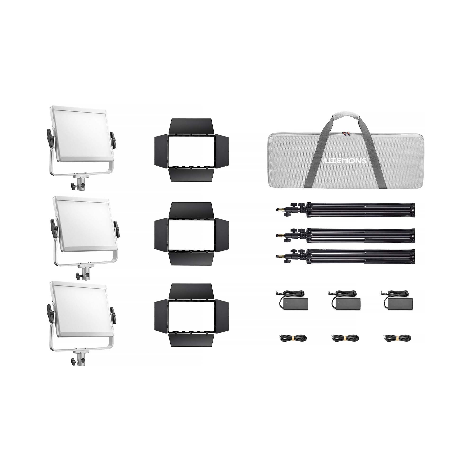 Η συσκευασία περιλαμβάνει: 3x φωτιστικό με σύστημα yoke για ρύθμιση κλίσης, 3x μετασχηματιστή ρεύματος, 3x καλώδιο ρεύματος, 3x πτερύγια, 3x light stands, τσάντα μεταφοράς.