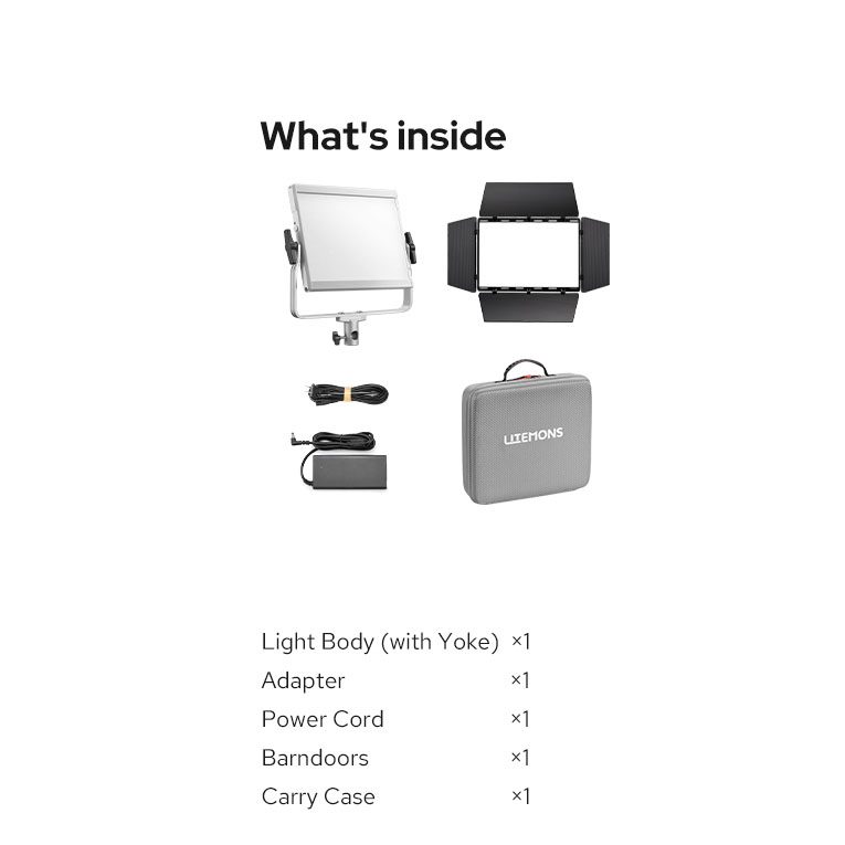 Η συσκευασία περιλαμβάνει: φωτιστικό με σύστημα yoke για ρύθμιση κλίσης, μετασχηματιστή ρεύματος, καλώδιο ρεύματος, τσάντα μεταφοράς, πτερύγια.