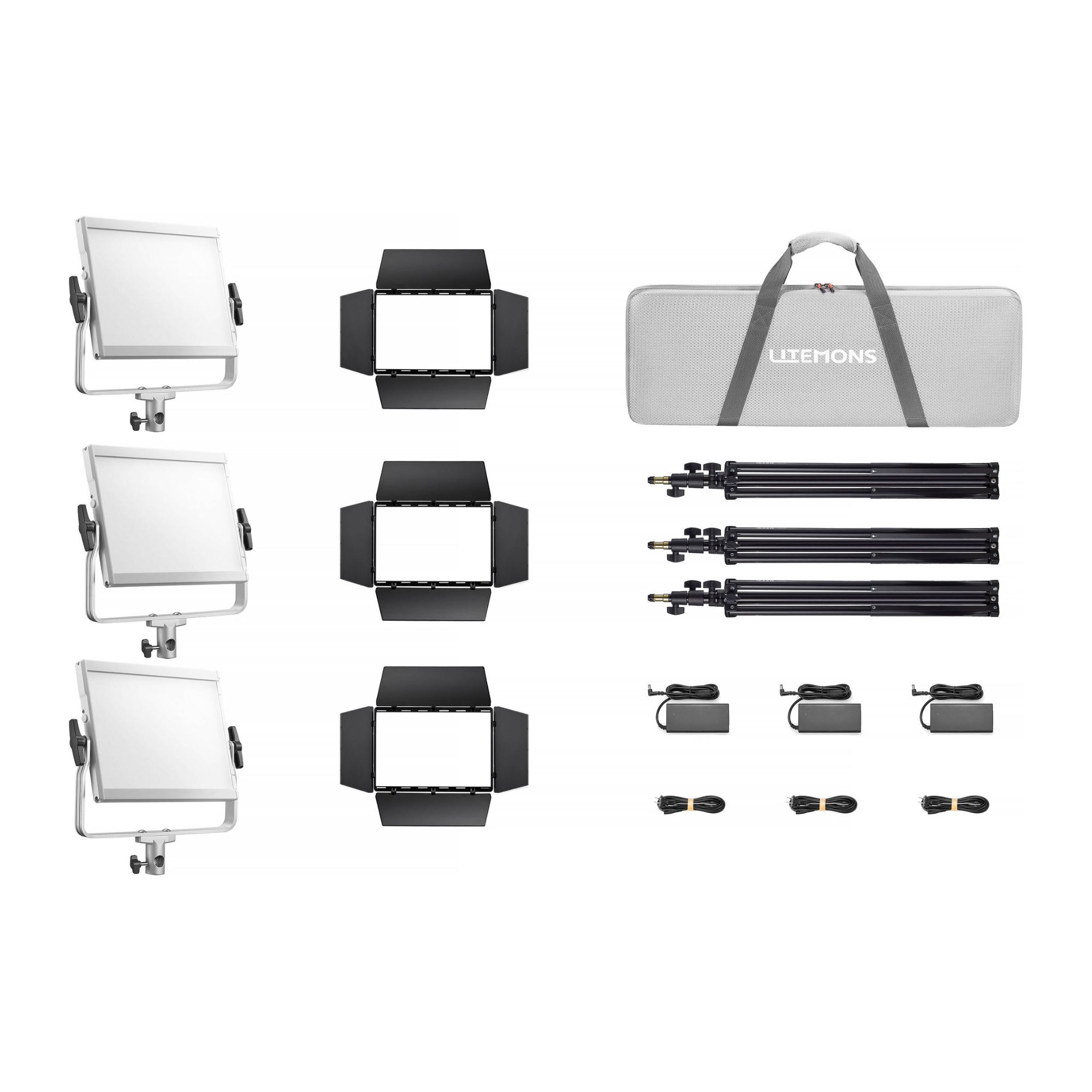 Η συσκευασία περιλαμβάνει: 3x φωτιστικό με σύστημα yoke για ρύθμιση κλίσης, 3x μετασχηματιστή ρεύματος, 3x καλώδιο ρεύματος, 3x πτερύγια, 3x light stand, τσάντα μεταφοράς.