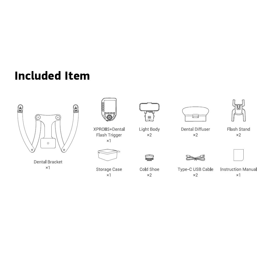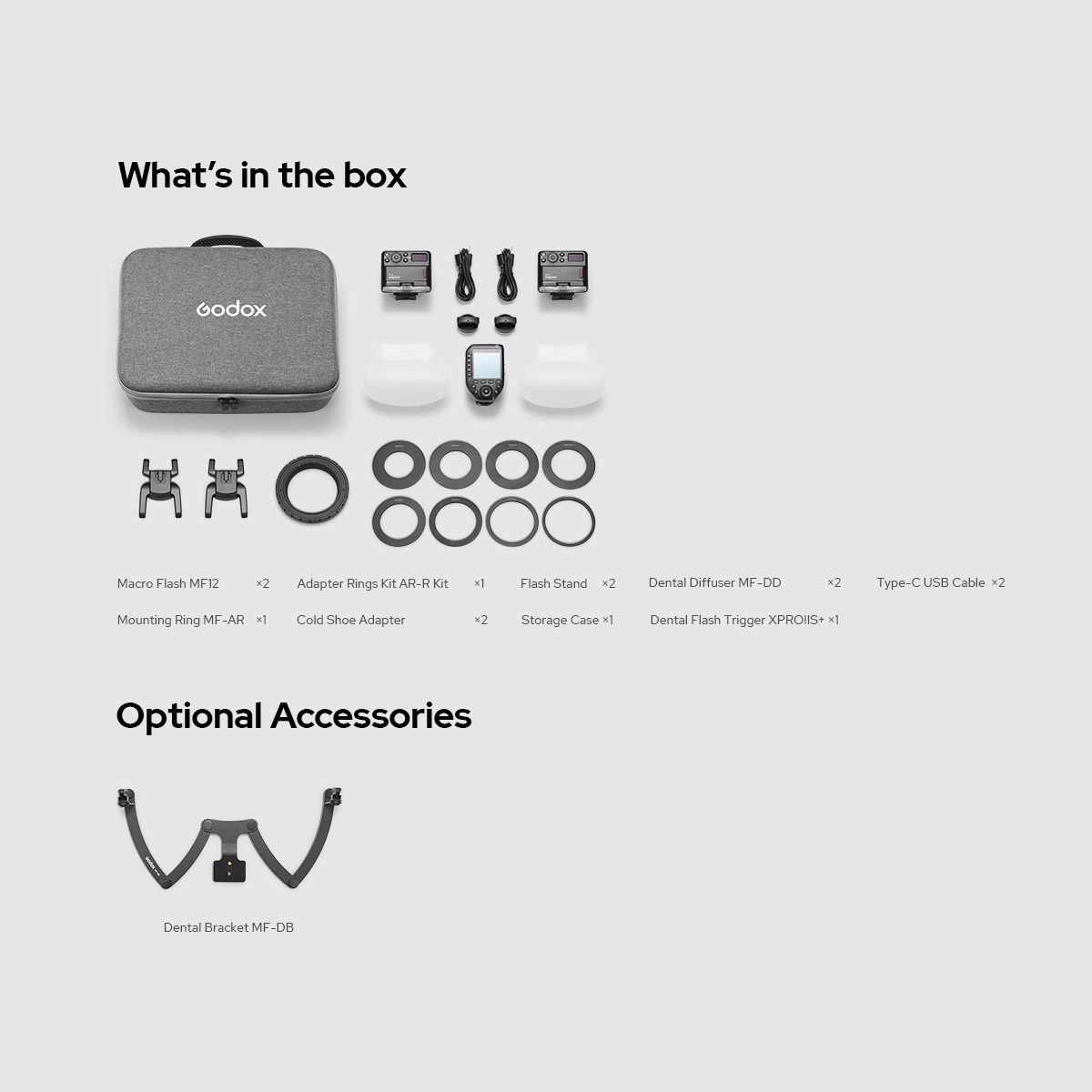 Η συσκευασία περιλαμβάνει: 2x MF12 Macro Flash, 1x Adapter Ring kit (49mm, 52mm, 55mm, 58mm, 62mm, 67mm, 72mm, 77mm), 2x flash stand, 2x dental diffuser, 2x καλώδιο USB Type-C, 1x mounting ring, 2x cold shoe adapters, 1x τσάντα μεταφοράς, 1x XproIIS+ trigger