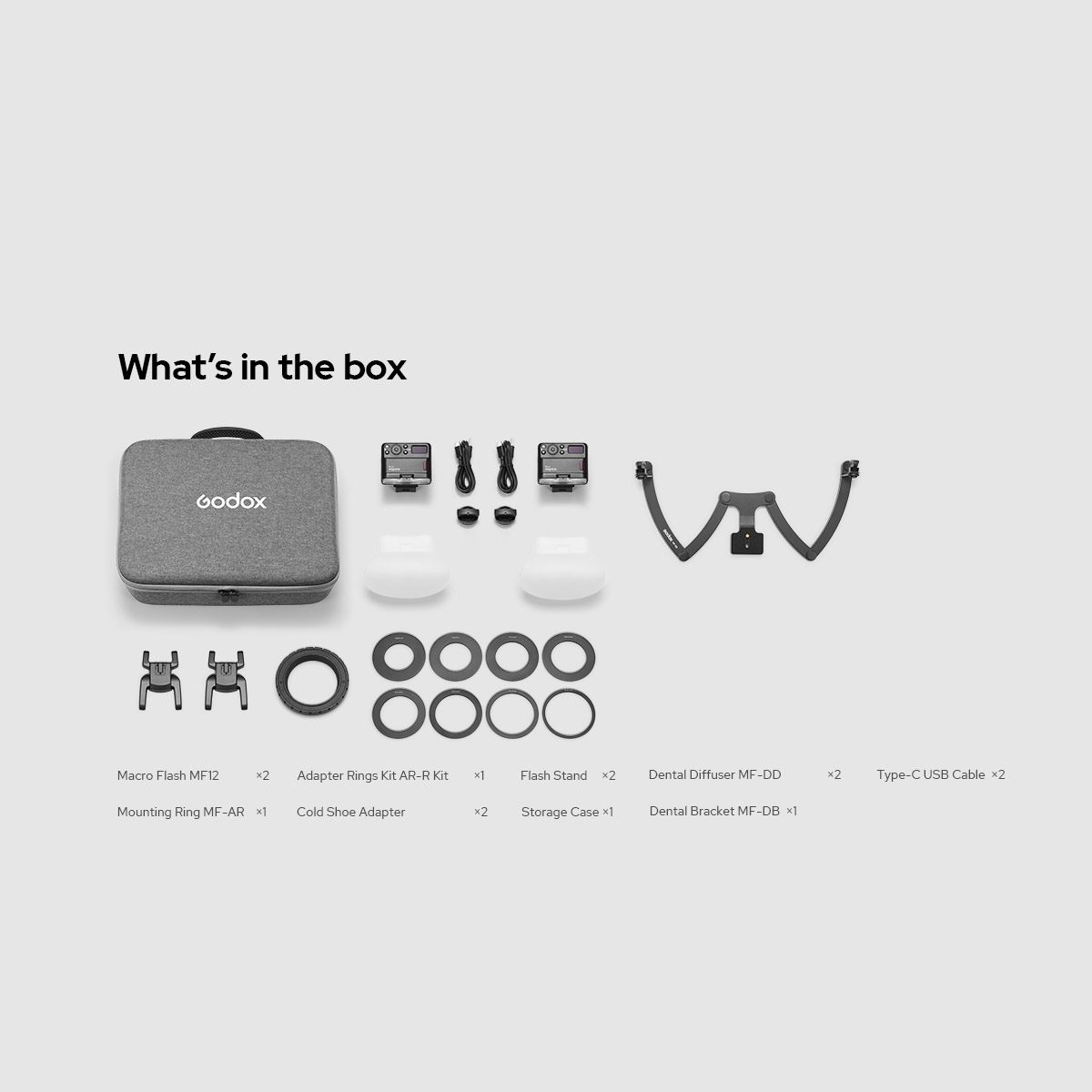 Η συσκευασία περιλαμβάνει: 2x MF12 Macro Flash, 1x MF-DB dental bracket, 1x Adapter Ring kit (49mm, 52mm, 55mm, 58mm, 62mm, 67mm, 72mm, 77mm), 2x flash stand, 2x dental diffuser, 2x καλώδιο USB Type-C, 1x mounting ring, 2x cold shoe adapters, 1x τσάντα μεταφοράς.