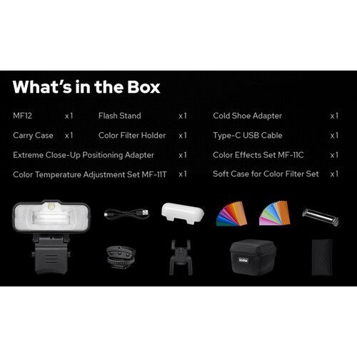 Η συσκευασία περιλαμβάνει: MF12 flash, Flash Stand, Cold Shoe adapter, Τσάντα μεταφοράς CB30, αντάπτορα προσαρμογής φίλτρων, καλώδιο USB Type-C, diffuser για πολύ κοντινό φωτισμό, σετ χρωματικών φίλτρων MF11C, σετ φίλτρων θερμοκρασίας MF11T, θήκη φίλτρων.