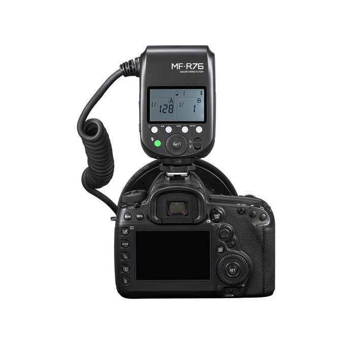 Το Godox MF-R76 είναι ένα manual Macro Ring Flash με GN14, συμβατό με μηχανές Canon, Nikon, Sony, Panasonic, Olympus, Fuji και Pentax. Τροφοδοτείται από επαναφορτιζόμενη μπαταρία λιθίου VB26/WB100 που του χαρίζει αυτονομία 660 λάμψεων πλήρους έντασης.