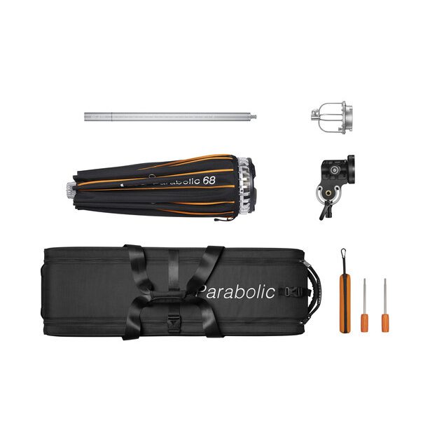 Το kit περιλαμβάνει: 1x Parabolic68 παραβολικό box, 1x αντάπτορα στήριξης studio flash, 1x Focusing Rod PF-R670, 1x PF-M Focusing Mount, 1x ατσάλινο καλώδιο ασφαλείας, 1x θήκη μεταφοράς CB35, 1x PB-G1 Grip Handle Set