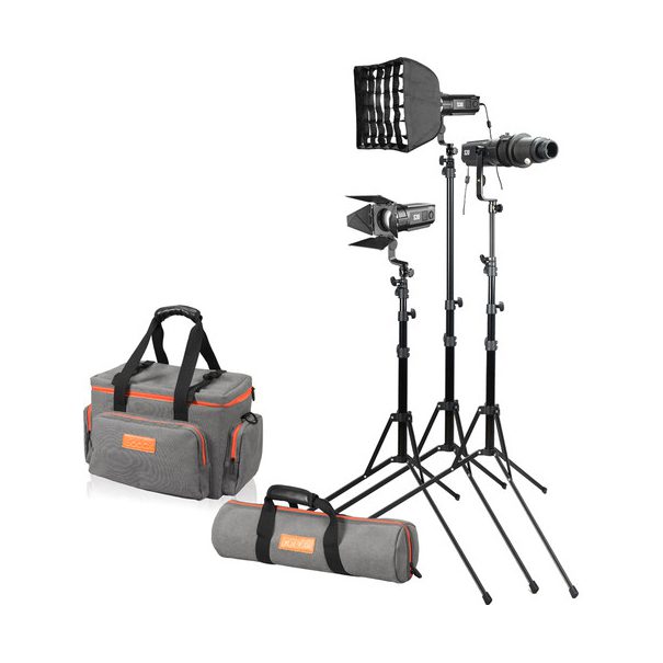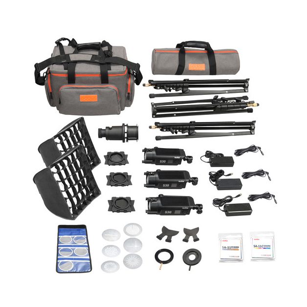 Πλήρες κιτ με 3x Godox S30 Focusing LEDs και πλούσιο πακέτο αξεσουάρ.