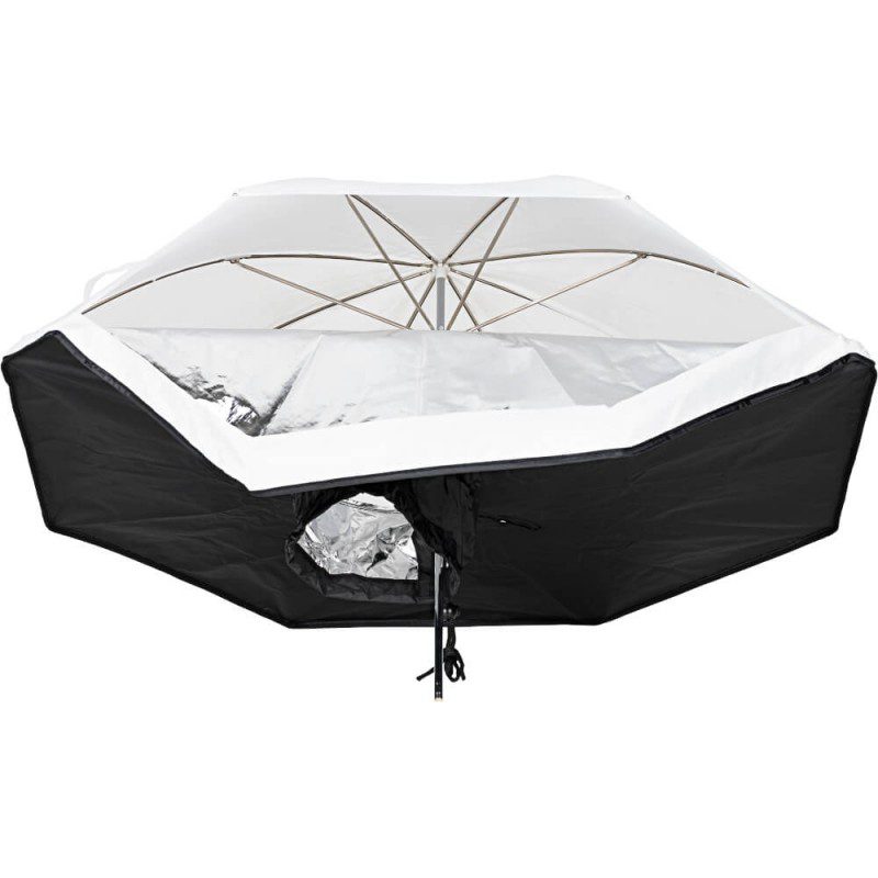 Υψηλής ποιότητας ομπρέλα διάχυσης διαμέτρου 85cm. Διαθέτει μαύρο υφασμάτινο κάλυμμα για έλεγχο φωτισμού. Περιλαμβάνει θήκη αποθήκευσης και μεταφοράς.