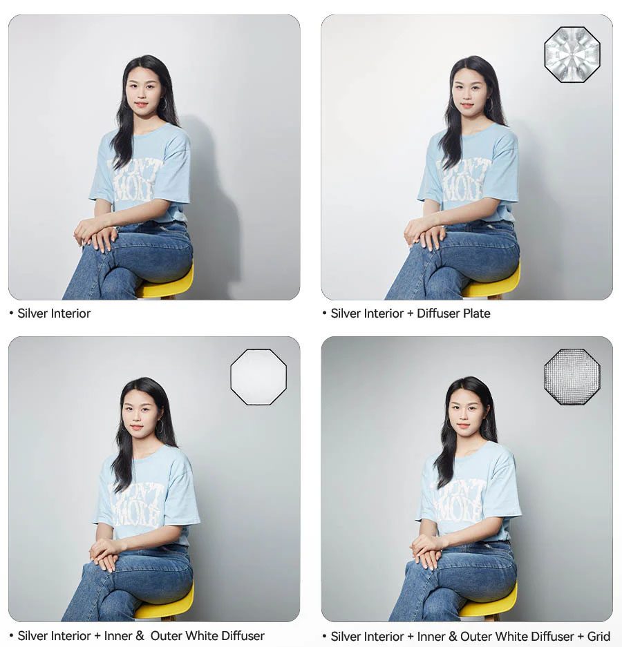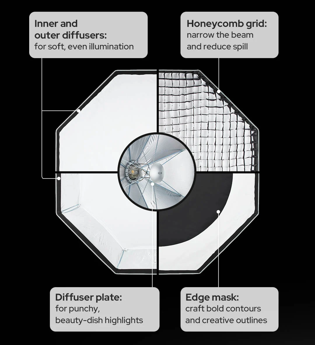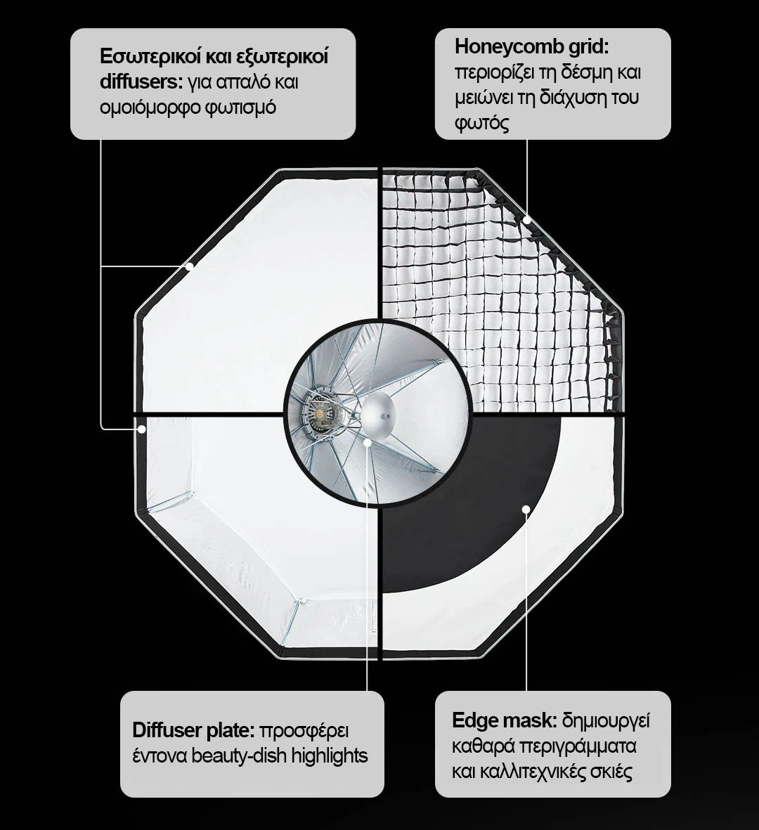 Διαθέτει διπλή διάχυση, deflector plate για χρήση σαν πτυσσόμενο beauty dish, και honeycomb grid για ακριβή κατεύθυνση του φωτός.