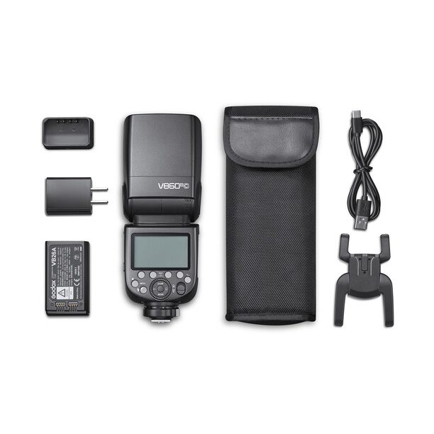 Η συσκευασία περιλαμβάνει: flash, mini stand, φορτιστή, μπαταρία VB26, καλώιο USB, αντάπτορας ρεύματος, θήκη μεταφοράς, εγχειρίδιο χρήσης.