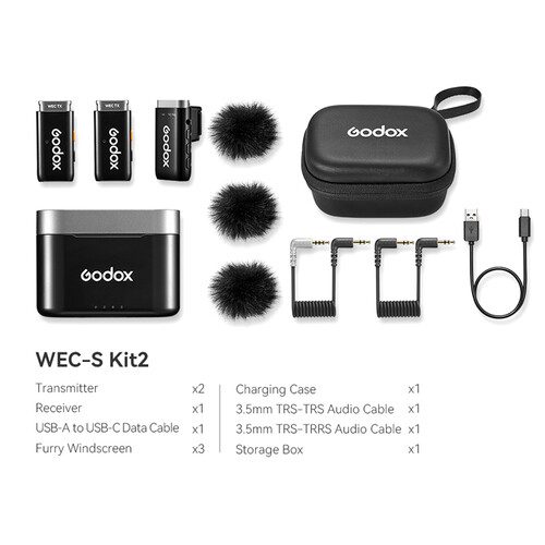 Το Godox WEC-S Kit2 είναι ένα μικρό, ελαφρύ και εύχρηστο σύστημα ασύρματων μικροφώνων, σχεδιασμένο για χρήση σε φωτογραφικές μηχανές Sony με υποδοχή MI-Shoe. Ξεχωρίζουν για την ιδιότητά του να επικοινωνούν με τη μηχανή χωρίς καλώδιο, αλλά απευθείας μέσω της υποδοχής MI. Ταυτόχρονα μέσω των εξόδων audio USB-C και TRS έχετε συμβατότητα χρήσης με οποιαδήποτε φωτογραφική μηχανή (χωρίς MI-Shoe), βιντεοκάμερες ή smartphone.