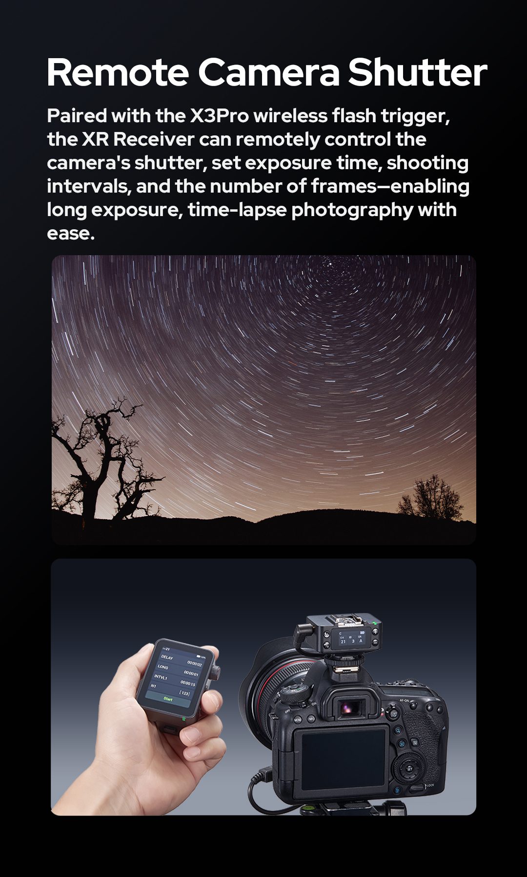 Όταν συνδυάζεται με τον πομπό X3 Pro, προσφέρει επιπλέον δυνατότητα προηγμένου απομακρυσμένου ελέγχου κλείστρου κάμερας, επεκτείνοντας τις δημιουργικές και λειτουργικές δυνατότητες του φωτογραφικού σας setup.