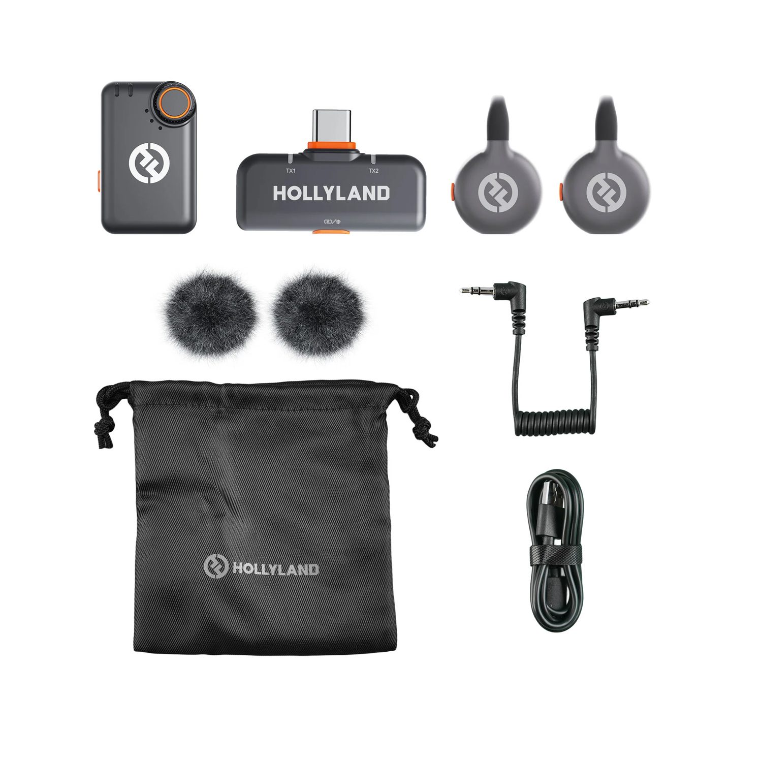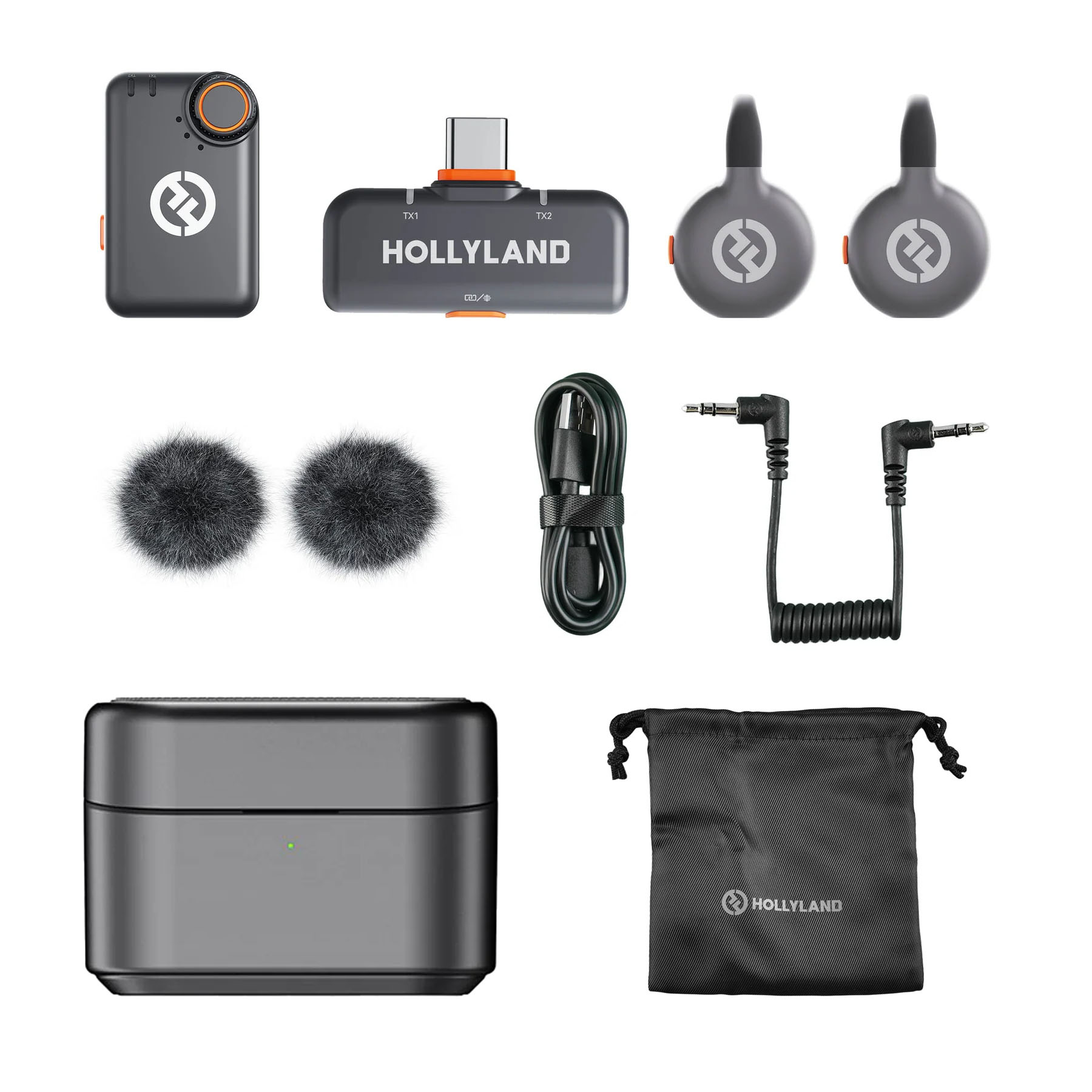 Lark M2S Mini Combo: 2x πομποί, 1x δέκτης κάμερας, 1x θήκη φόρτισης, 1x USB-C plug, 2x αντιανέμιο, 1x καλώδιο USB-A to USB-C, 1x καλώδιο 3.5mm TRS to TRS.