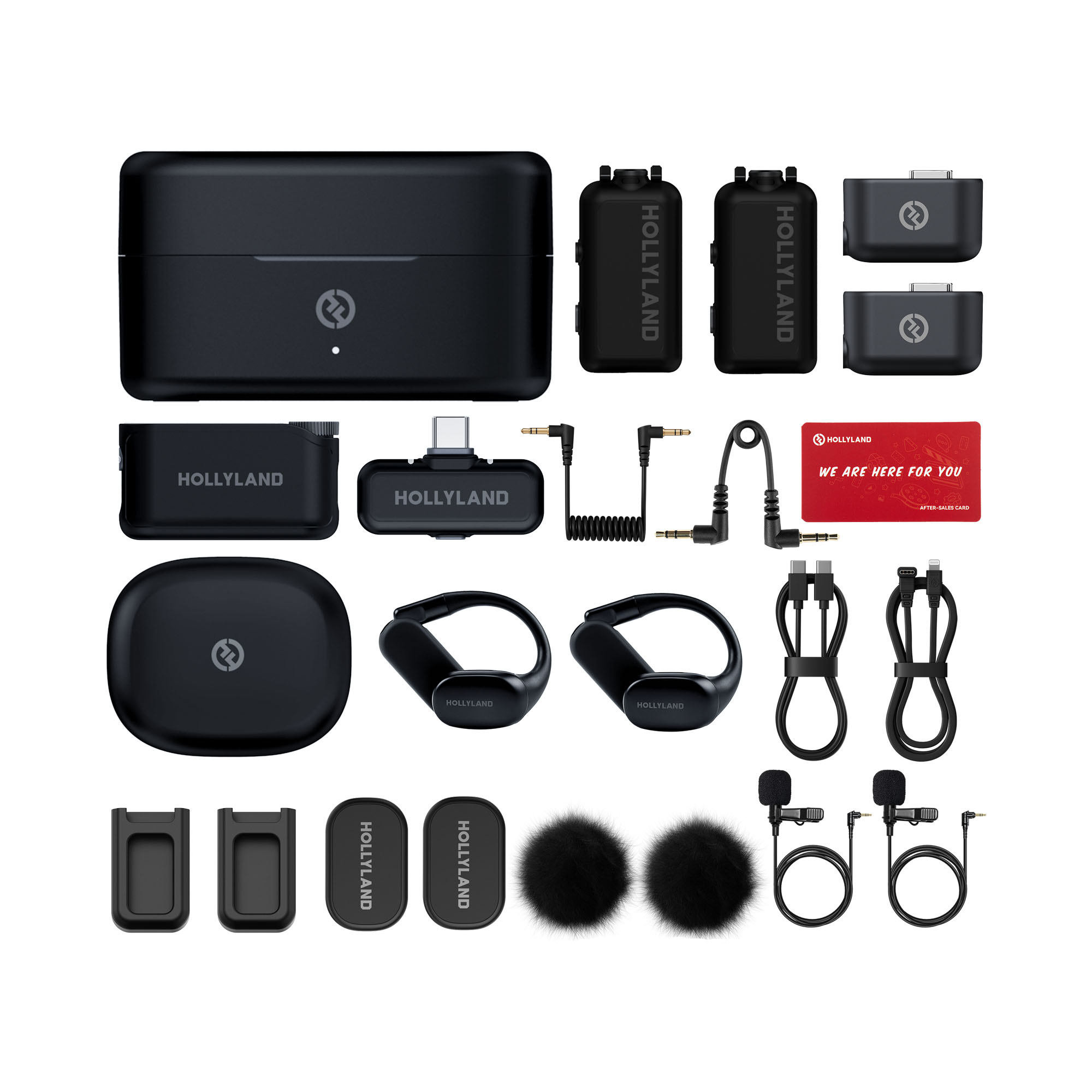 Η συσκευασία περιλαμβάνει: 2 πομποί, 1 δέκτης για κάμερα, 1 δέκτης USB-C, 1 θήκη φόρτισης, 2 αντιανεμικά τύπου «γούνα», 1 καλώδιο USB-C σε Lightning, 1 καλώδιο 3.5mm TRS σε 3.5mm TRS, 1 καλώδιο 3.5mm TRS σε 3.5mm TRS (2.8″), 1 καλώδιο USB-C σε USB-C, 1 κάρτα περιεχομένων, 2 ακουστικά παρακολούθησης OWS, 1 θήκη φόρτισης ακουστικών, 2 πανκατευθυντικά μικρόφωνα πέτου, 2 αντάπτορες USB-C σε 3.5mm, 2 μαγνητικές σιλικονούχες θήκες και 2 μαγνήτες.