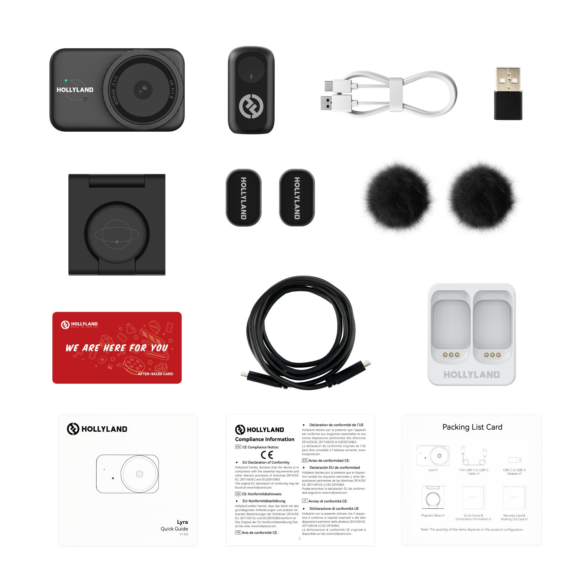 Η συσκευασία περιλαμβάνει: 1x Lyra, 1x καλώδιο USB-C σε USB-C 3.0 (1,5 m), 1x αντάπτορα USB-C σε USB-A, 1x μαγνητική βάση στήριξης, 1x πομπό LARK A1, 1x αντιανεμικό κάλυμμα (Furry Windshield), 1x βάση φόρτισης (Charging Dock), 1x μαγνήτη LARK A1, 1x καλώδιο USB-A σε USB-C, 1x κάρτα εγγύησης, 1x γρήγορο οδηγό χρήσης.