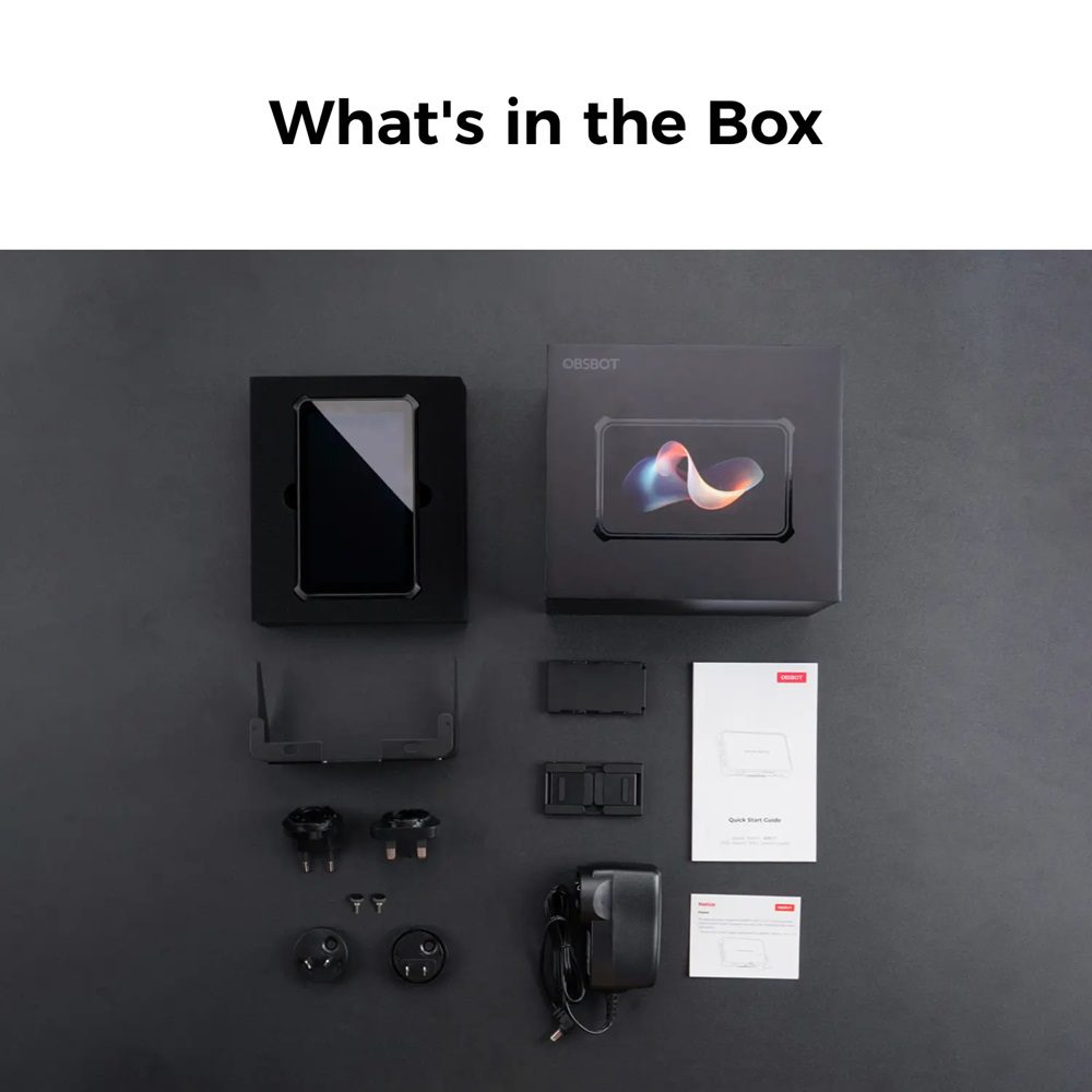 Η συσκευασία περιλαμβάνει: 1 x OBSBOT Talent, 1 x Power Adapter, 2 x Mini Stand, 1 x Sun Hood, 2 x Thumb Screws