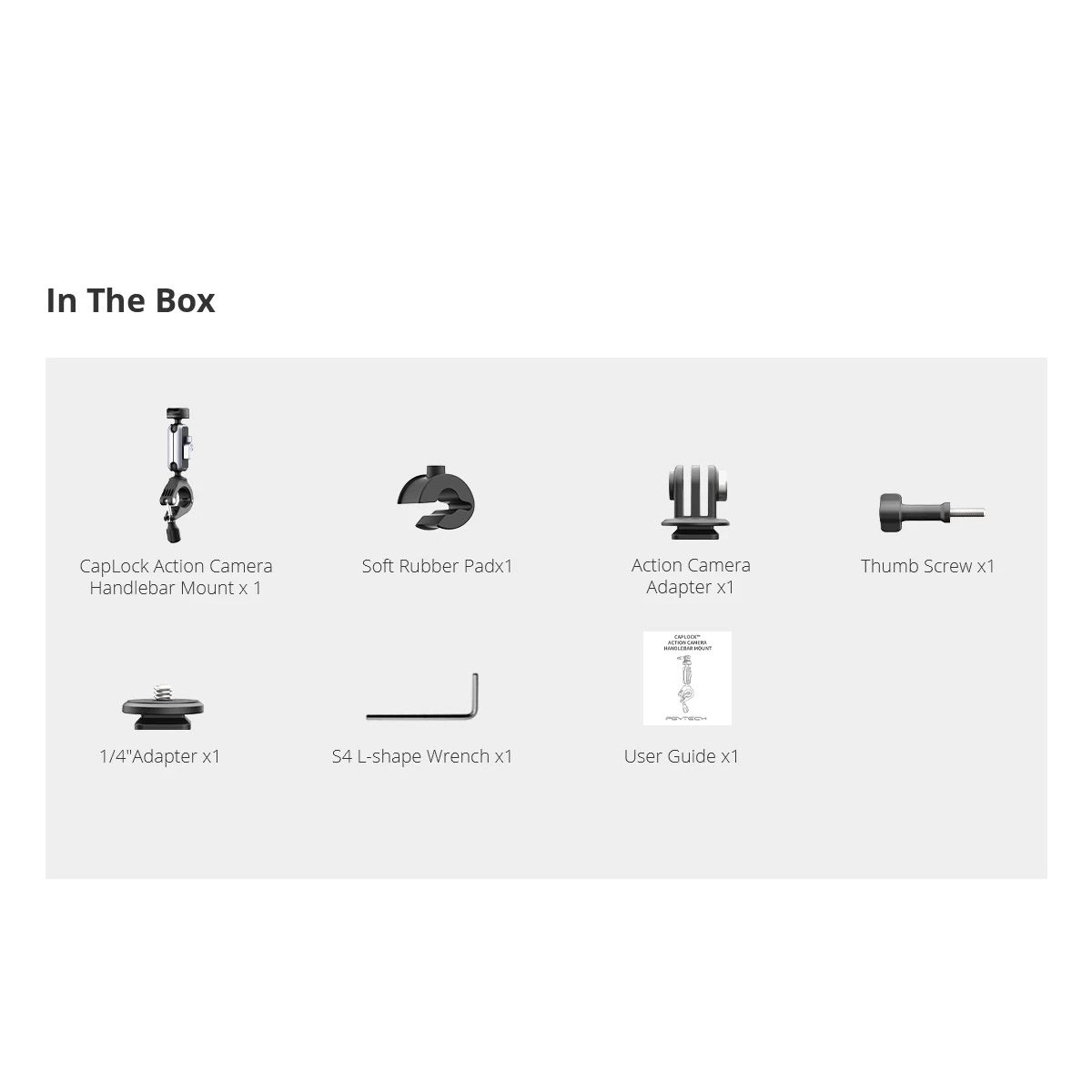 Η συσκευασία περιλαμβάνει: βάση τιμονιού με arm, λαστιχένιος αντάπτορας σύσφιξης, πλακάκι με action camera adapter, πλακάκι με βίδα ¼’’, βίδα, άλεν