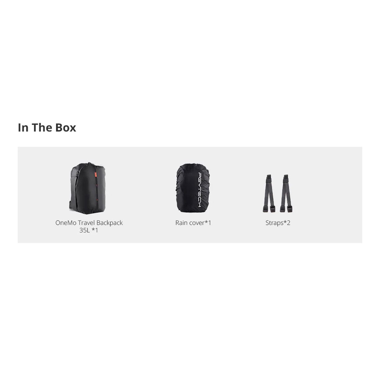 Η συσκευασία περιλαμβάνει: PGYTECH OneMo Travel Backpack, κάλυμμα βροχής, ζώνη μέσης.