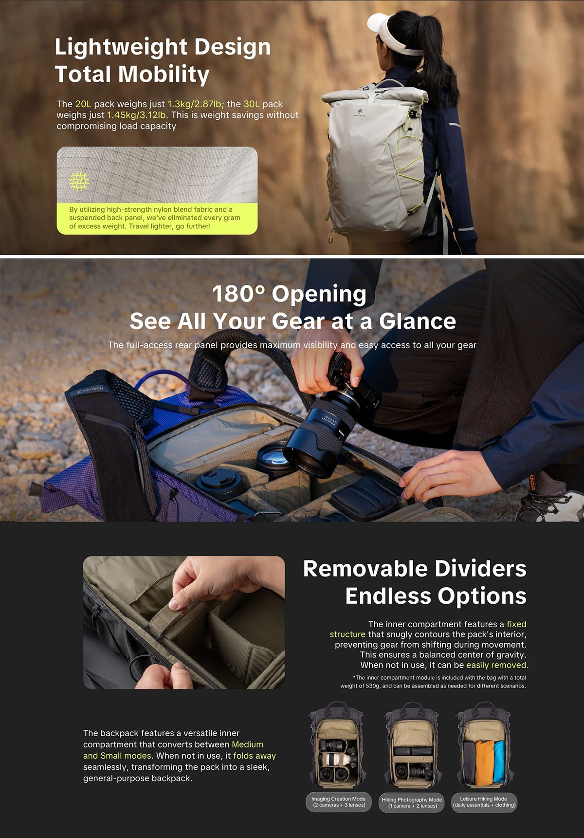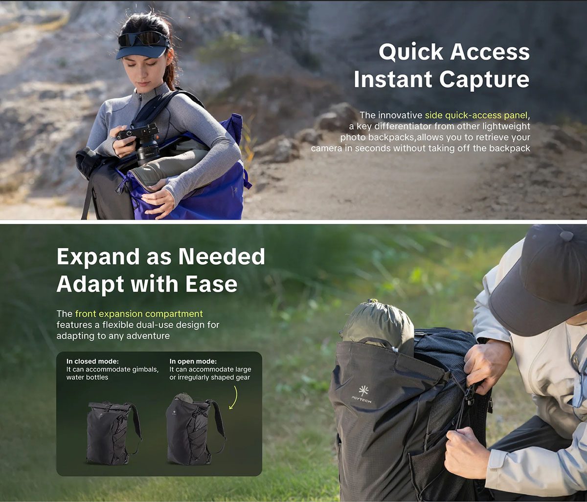 Η κατασκευή από ανθεκτικό, ελαφρύ ύφασμα υψηλής αντοχής διατηρεί χαμηλό βάρος χωρίς συμβιβασμούς στη σταθερότητα φορτίου. Το κύριο διαμέρισμα ανοίγει πλήρως στις 180°, διευκολύνοντας την οργάνωση, με αφαιρούμενο και αναδιαμορφώσιμο διαχωριστικό. Η πλαϊνή θήκη γρήγορης πρόσβασης επιτρέπει άμεση λήψη της κάμερας, ενώ οι επεκτάσιμες θήκες προσφέρουν επιπλέον χώρο για gimbal, υδροδοχείο ή πρόσθετο εξοπλισμό, ενώ φιλοξενεί με ασφάλεια φορητό υπολογιστή έως 14″.