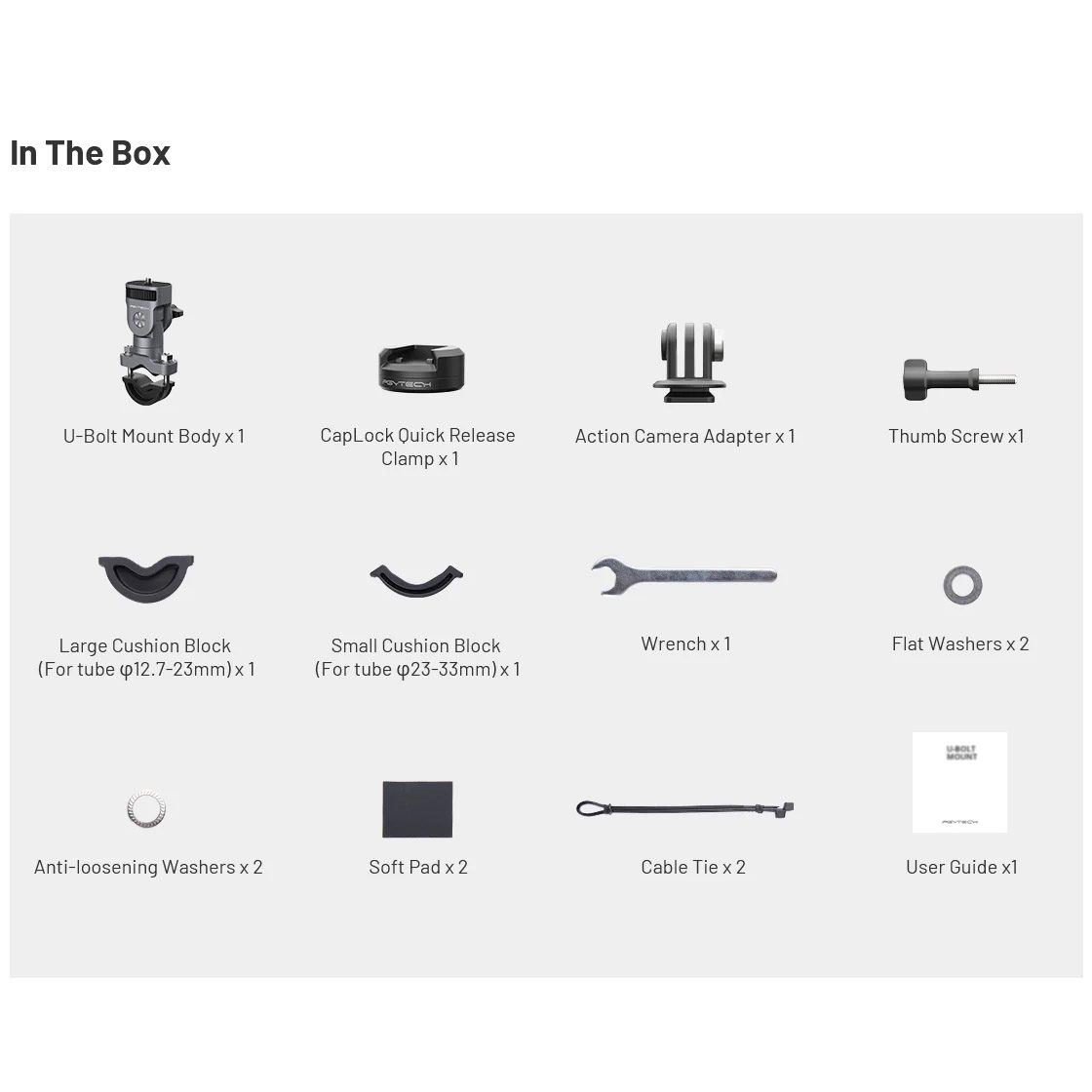 Η συσκευασία περιλαμβάνει: PGYTECH U-Bolt Mount, CapLock Quick Release Clamp, Action Camera Adapter, 2x Block σύσφιξης, κλειδί, 2 x Flat ροδέλες, 2 x αντιολισθητικές ροδέλες, 2 x Soft Pad, 2 x ιμάντες πρόσδεσης.