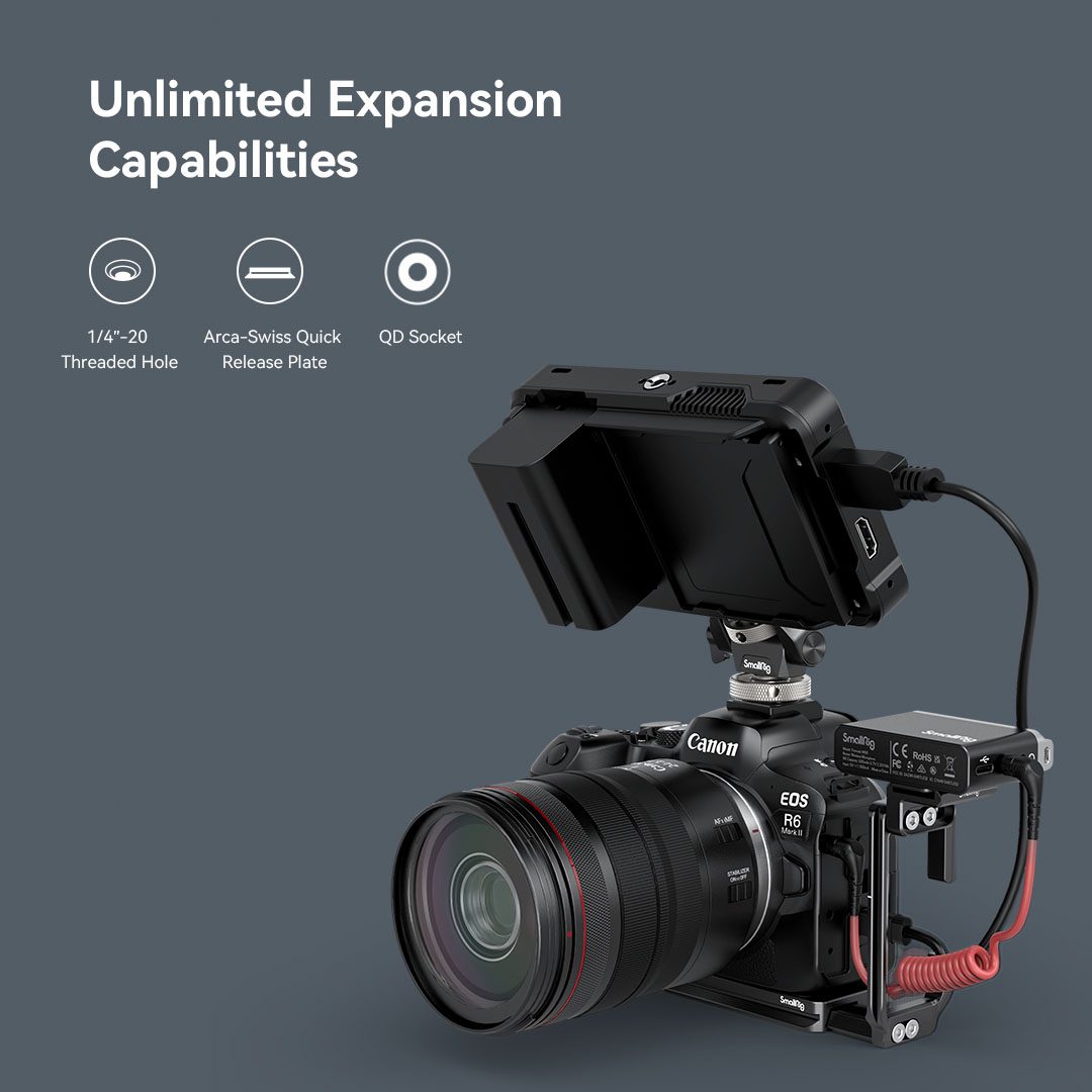 Διαθέτει πολλαπλά σπειρώματα 1/4″-20, υποστήριξη λουριών και QD, καθώς και επεκτεινόμενη πλευρική πλάκα για διέλευση καλωδίων και χρήση οθόνης σε κάθετο setup.