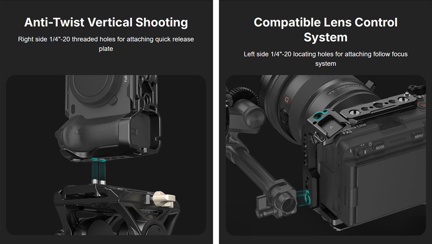 Το SmallRig Cage για Sony FX30 / FX3 / FX3A είναι ένα modular cage προστασίας με πολλά σημεία στήριξης, ειδικό στήριγμα καλωδίου HDMI και ενσωματωμένη βάση Arca-Swiss για γρήγορη μετάβαση σε rig και gimbal.