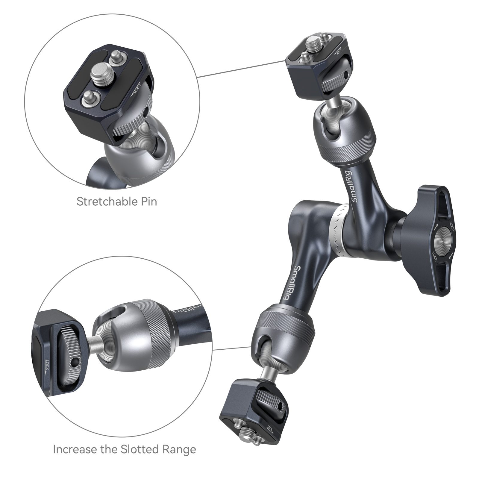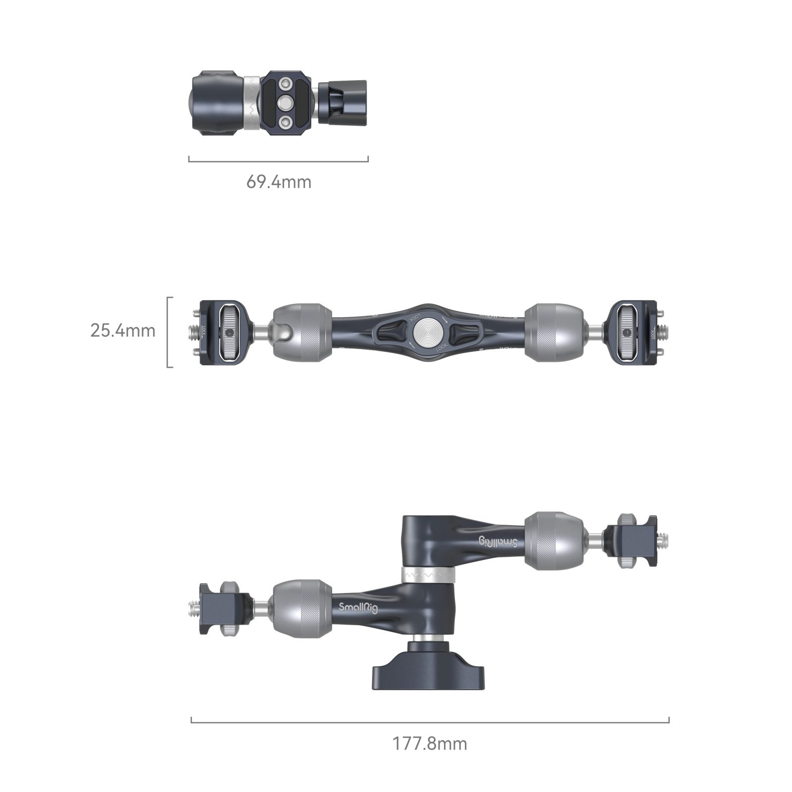 Το SmallRig Rosette Arm (18cm) είναι ένας συμπαγής βραχίονας στήριξης για ασφαλή τοποθέτηση αξεσουάρ σε camera rigs, συνδυάζοντας άρθρωση rosette από ανοξείδωτο χάλυβα και διπλές κεφαλές ball για ευέλικτη ρύθμιση γωνίας. Η CNC κατασκευή αλουμινίου υποστηρίζει φορτίο έως 3.5 kg με υψηλή ακαμψία και ακρίβεια κλειδώματος.