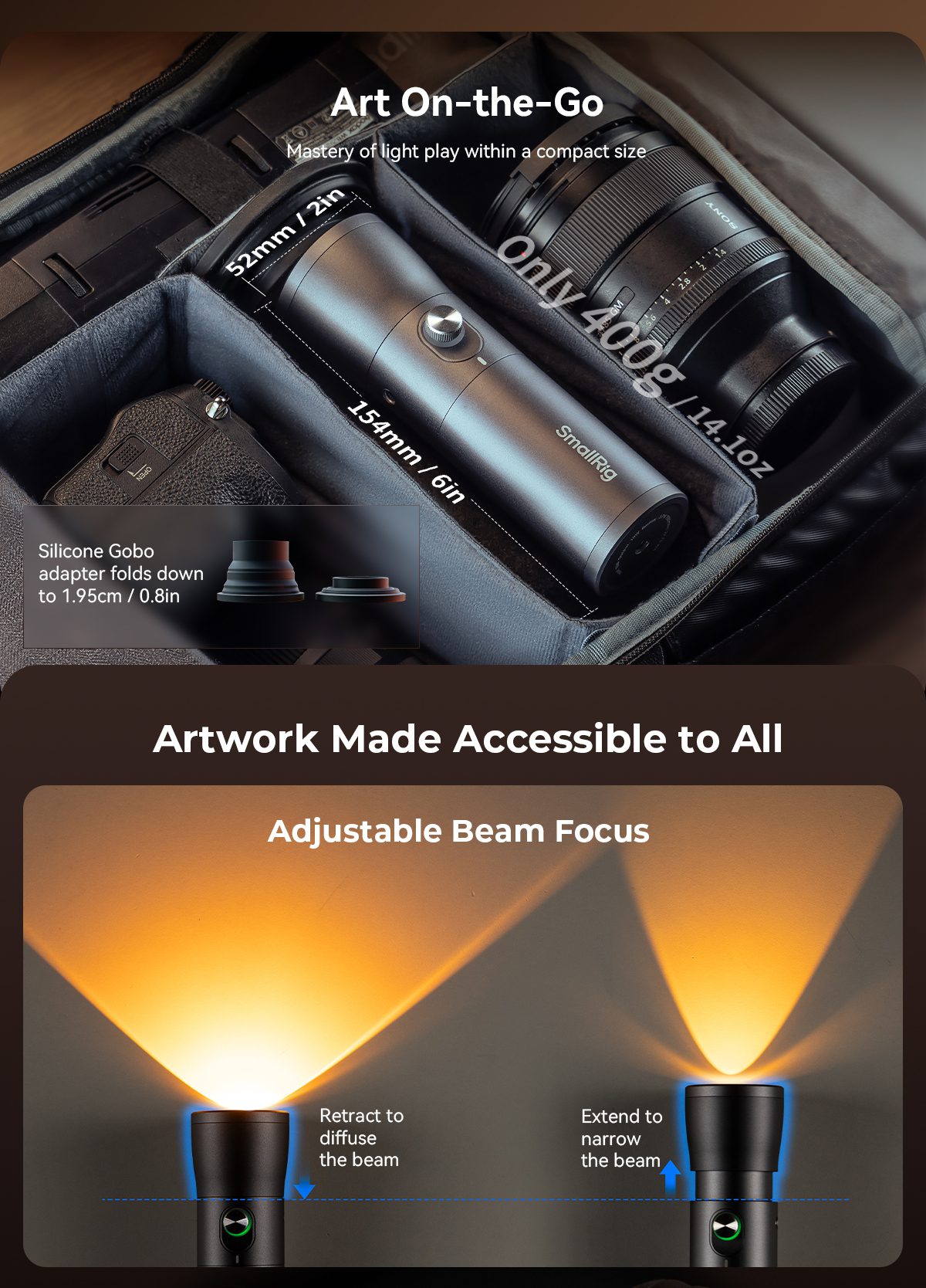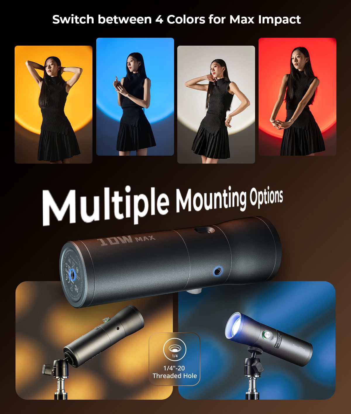 Συμπαγές LED φωτιστικό με δυνατότητα εστίασης και τετραχρωμία, σχεδιασμένο για φορητές και δημιουργικές εφαρμογές φωτισμού.