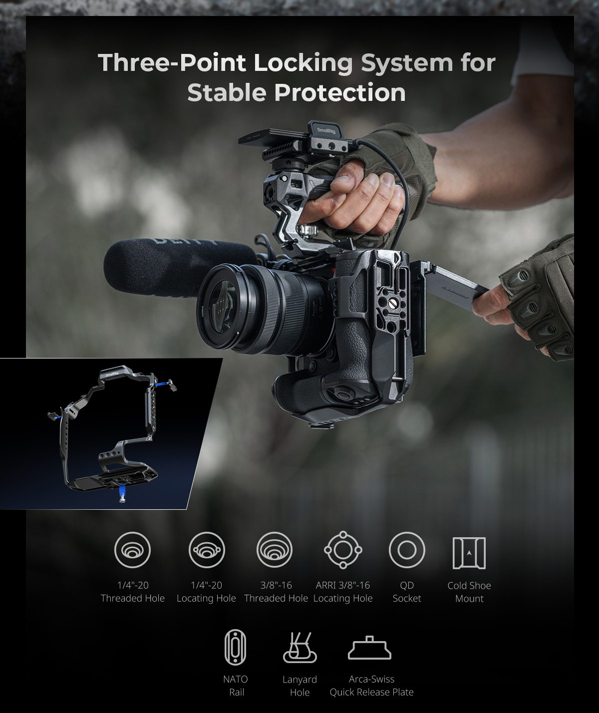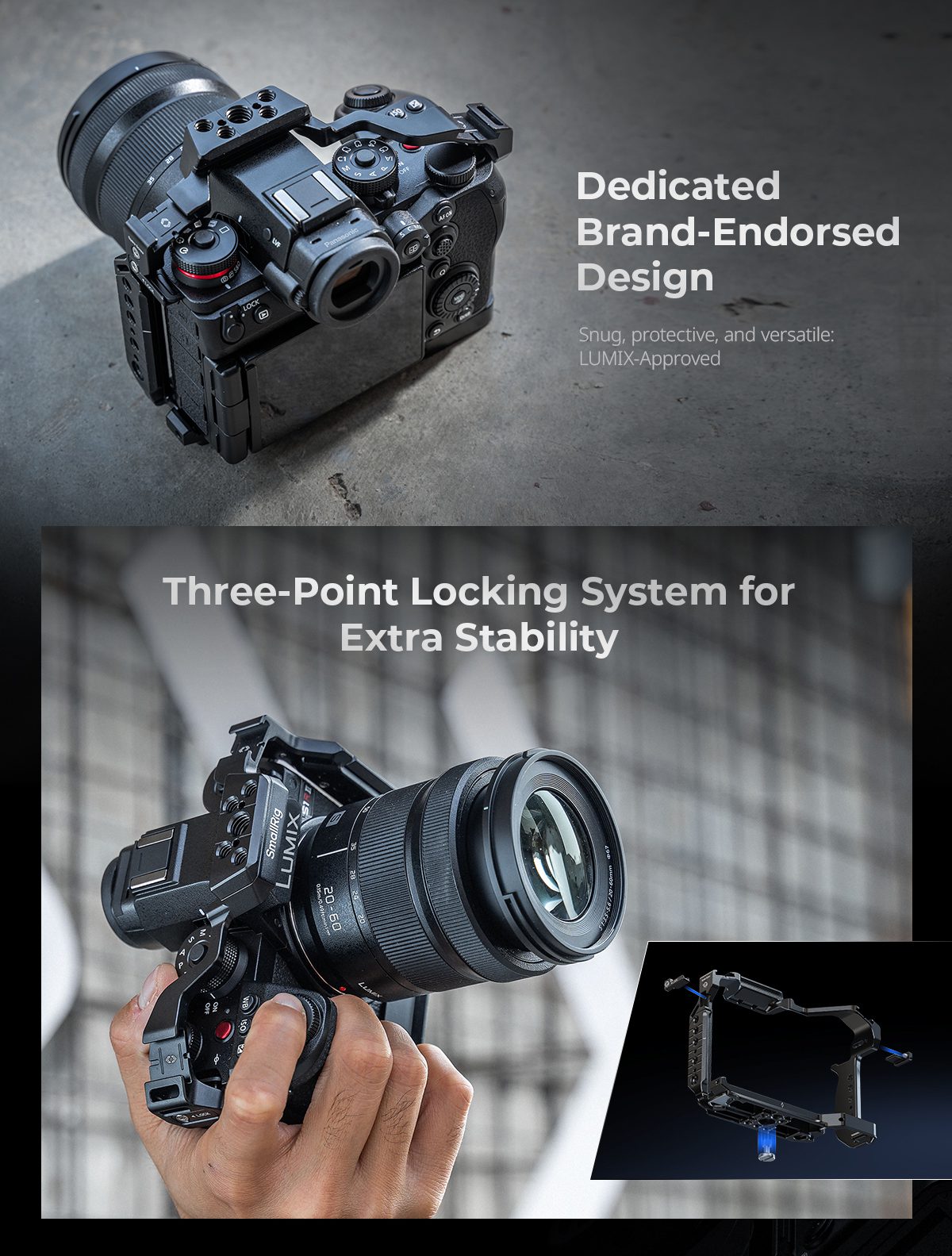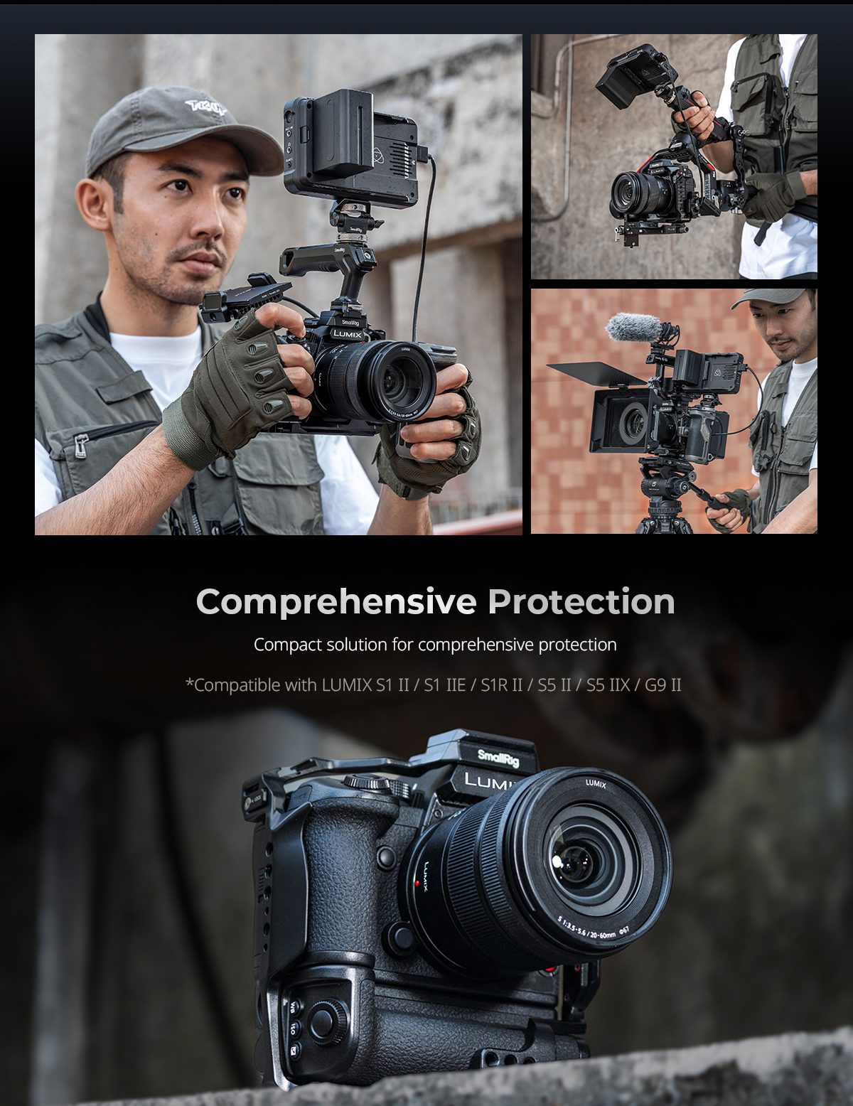 Το SmallRig Cage για Panasonic LUMIX S1 II / S5 II / G9 II Series είναι σχεδιασμένο για προστασία της κάμερας και επέκταση με αξεσουάρ, με NATO rails, cold shoe υποδοχές και ARRI-style σημεία στήριξης.