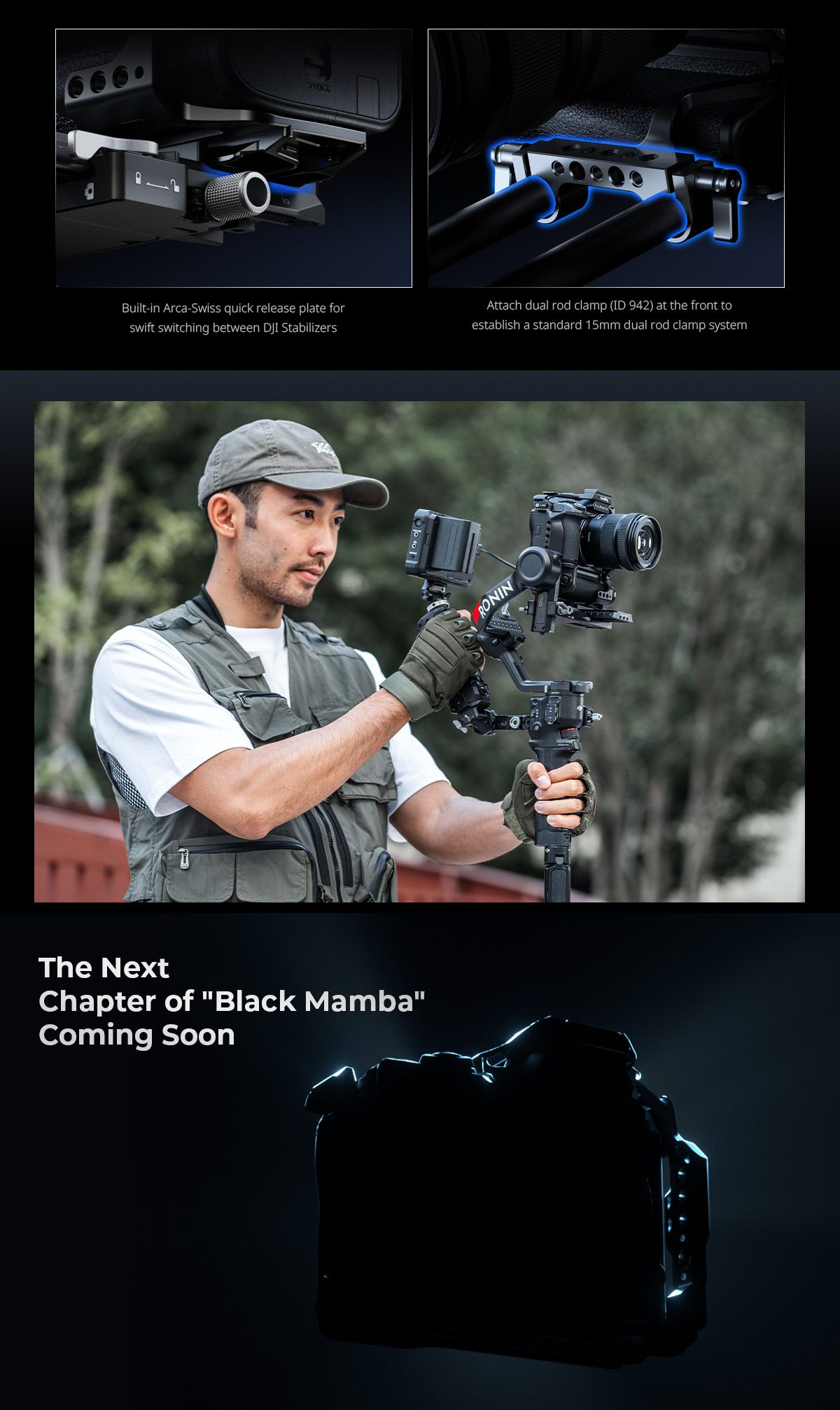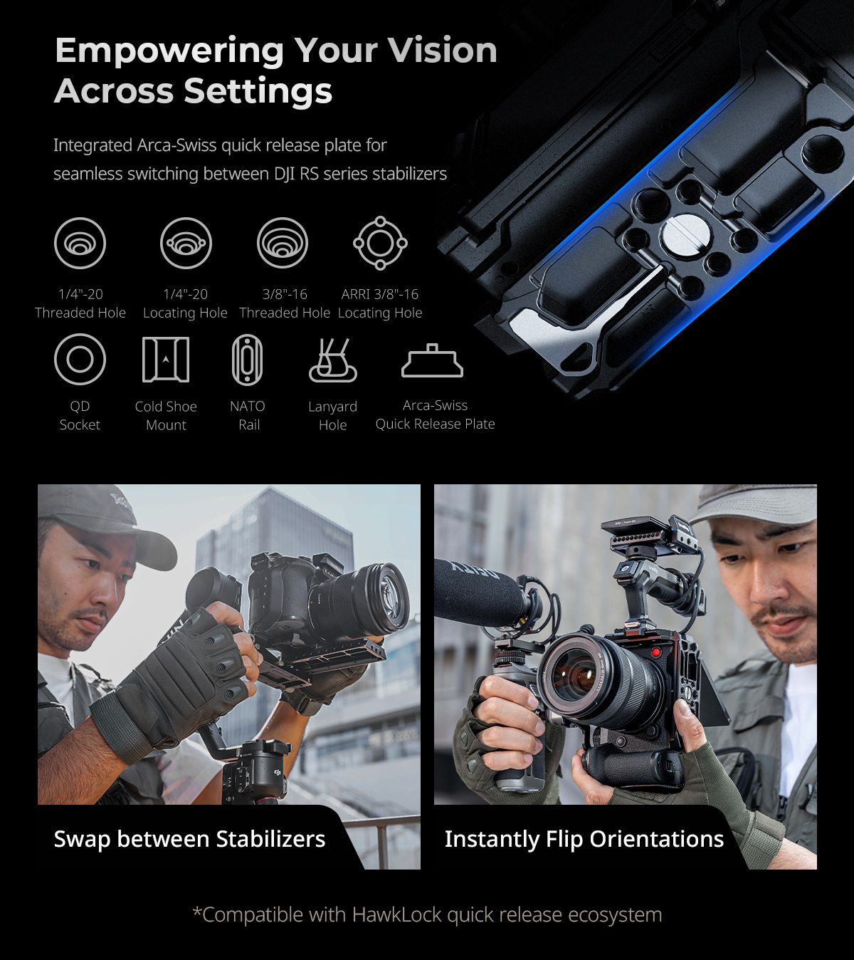 Η βάση Arca-Swiss και το QD socket υποστηρίζουν άμεση εναλλαγή μεταξύ tripod και gimbal setup, με μαγνητικό εργαλείο για γρήγορη εγκατάσταση.