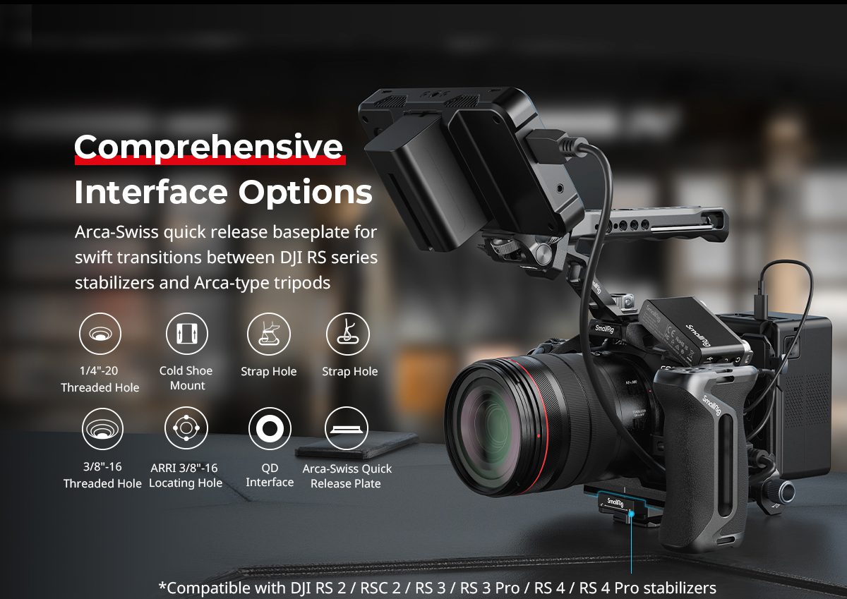Διαθέτει μηχανισμό HawkLock, H21 NATO ράγες, πολλαπλά σπειρώματα 1/4″-20, υποδοχή QD και βάση Arca-Swiss για εύκολη εναλλαγή μεταξύ τρίποδου και gimbal. Περιλαμβάνει μαγνητικό εργαλείο και γυαλί προστασίας 9H.