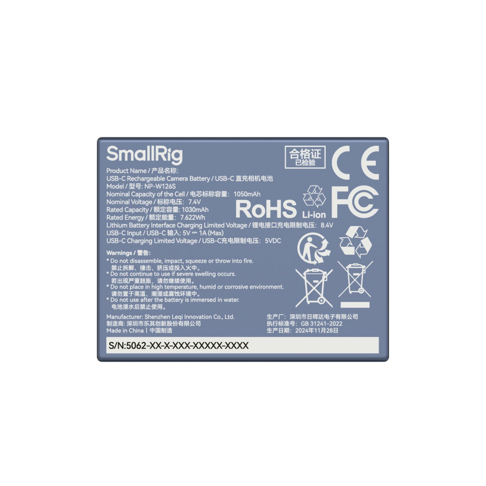 Η SmallRig NP-W126S USB-C μπαταρία προσφέρει χωρητικότητα 1050mAh, γρήγορη φόρτιση 5V, πλήρη συμβατότητα και ανθεκτικό πυράντοχο περίβλημα ABS+PC για αξιόπιστη τροφοδοσία παντού.