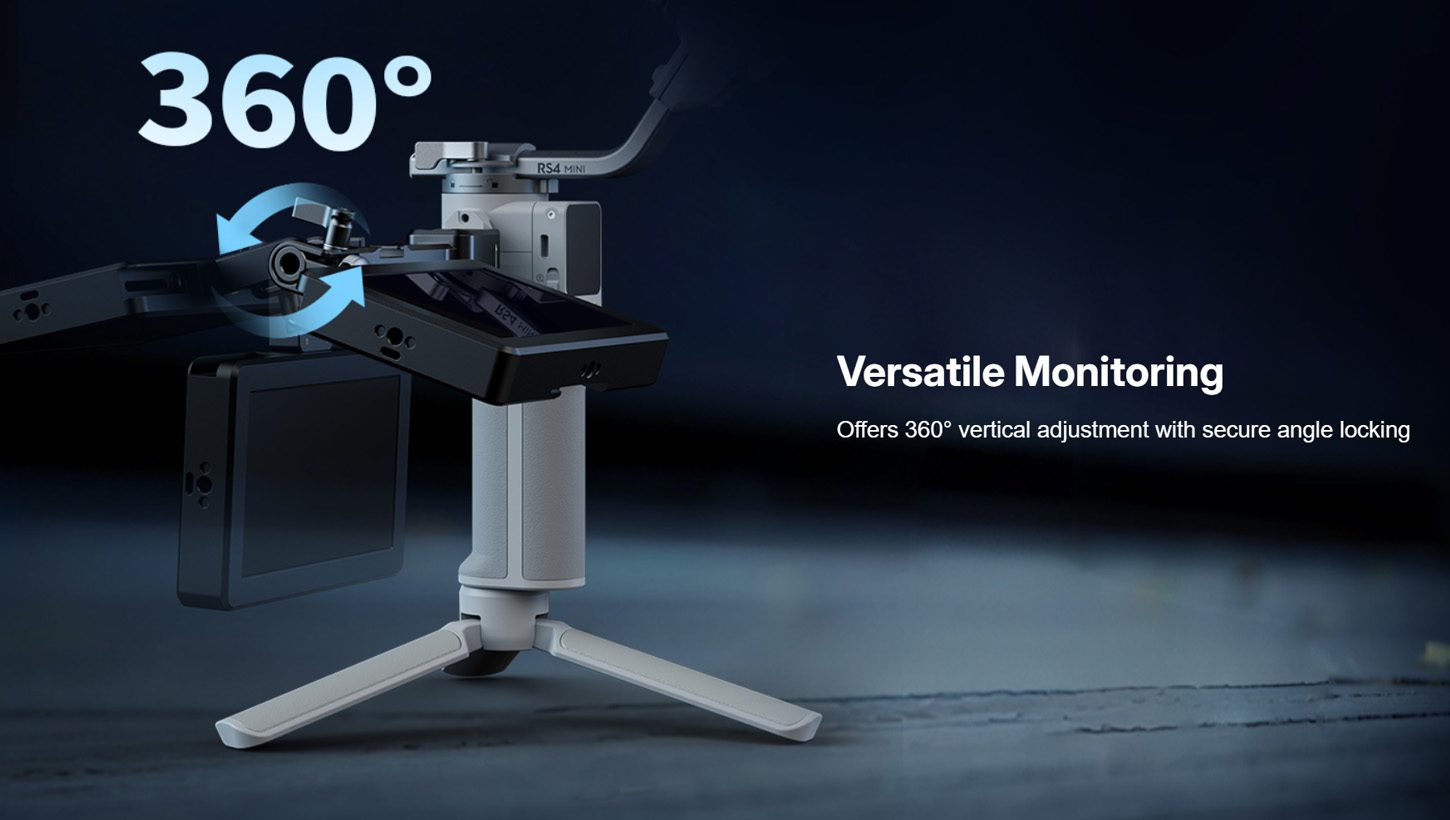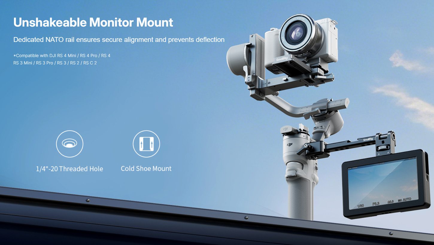 Το SmallRig Monitor Mount για DJI RS Series επιτρέπει ασφαλή και ευέλικτη τοποθέτηση monitor σε gimbal της σειράς DJI RS μέσω NATO clamp. Υποστηρίζει φορτίο έως 1.5 kg, προσφέρει αδιάκοπη περιστροφή 360° και διαθέτει πολλαπλά σημεία στήριξης αξεσουάρ.