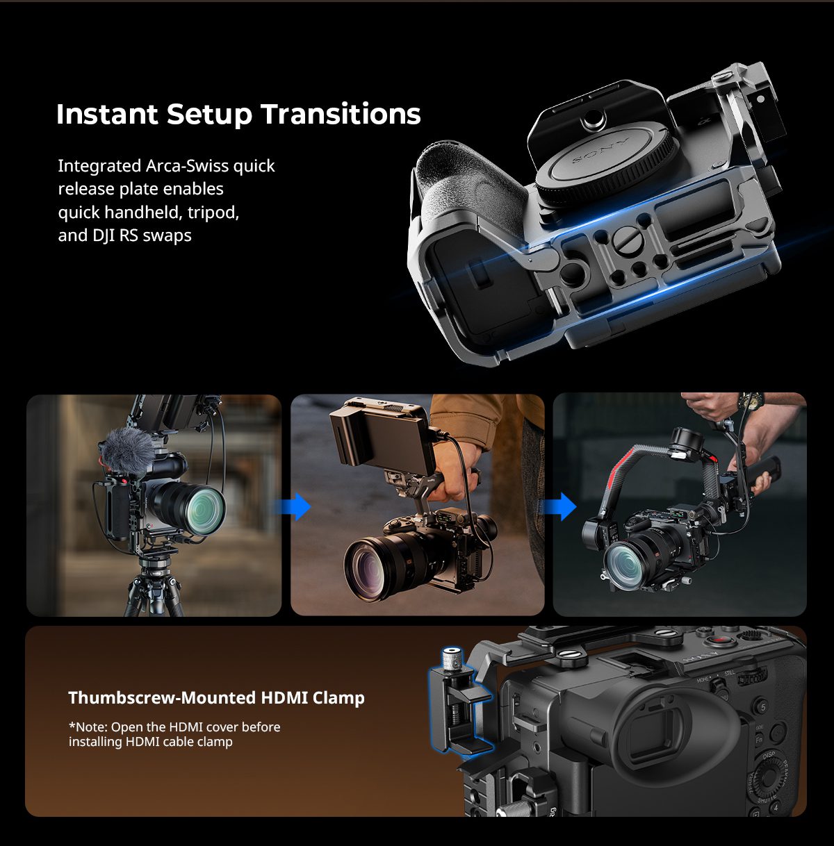 Διατηρεί πλήρη πρόσβαση στα χειριστήρια και τις θύρες, διαθέτει αποσπώμενη επάνω πλάκα με NATO rail, cold shoe και θύρα QD, ενώ η βάση Arca-Swiss επιτρέπει ταχεία εναλλαγή ανάμεσα σε λήψεις στο χέρι, τρίποδο και gimbal.