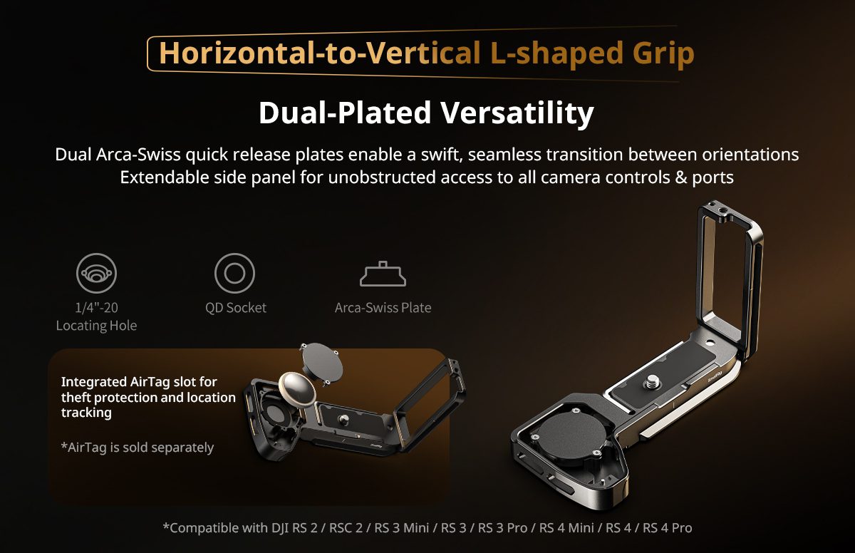 Το SmallRig L-Shaped Mount Plate με AirTag Slot για Sony Alpha 7 Series είναι σχεδιασμένο για γρήγορη εναλλαγή οριζόντιας και κάθετης λήψης, με επεκτεινόμενη πλευρική πλάκα για διέλευση καλωδίων και ενσωματωμένη υποδοχή AirTag για tracking.