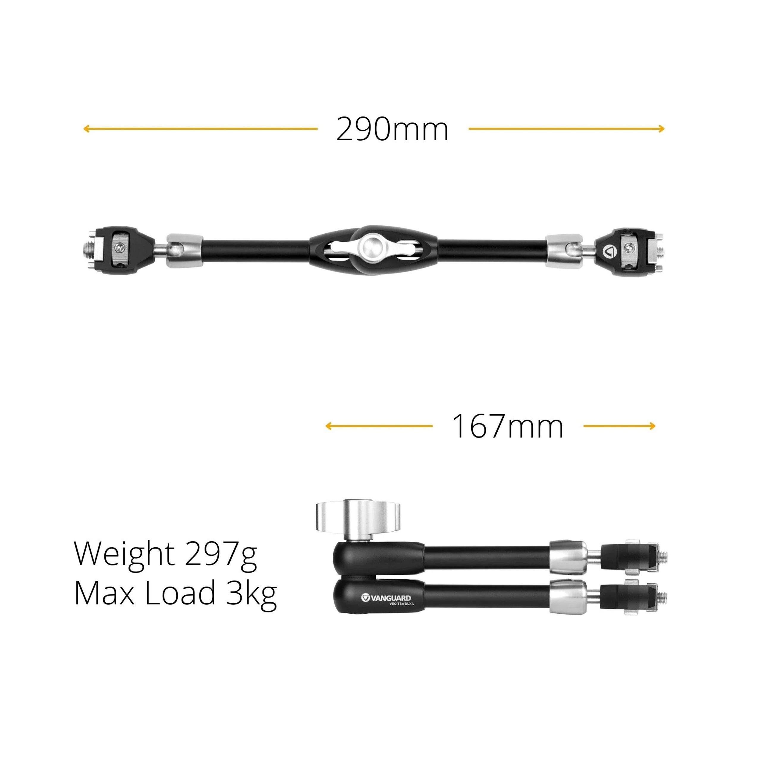 Το Vanguard VEO TSA DLX L είναι ένας heavy duty βραχίονας τύπου arm κατασκευασμένος εξ’ ολοκλήρου από αλουμίνιο αεροπορικών προδιαγραφών με μήκος 29cm και μέγιστο υποστηριζόμενο φορτίο στα 3kgs. Συνδέεται σε τρίποδα, cages ή άλλα αξεσουάρ με θηλυκό πάσο 1/4-inch (ή 3/8-inch με παρεχόμενο αντάπτορα).